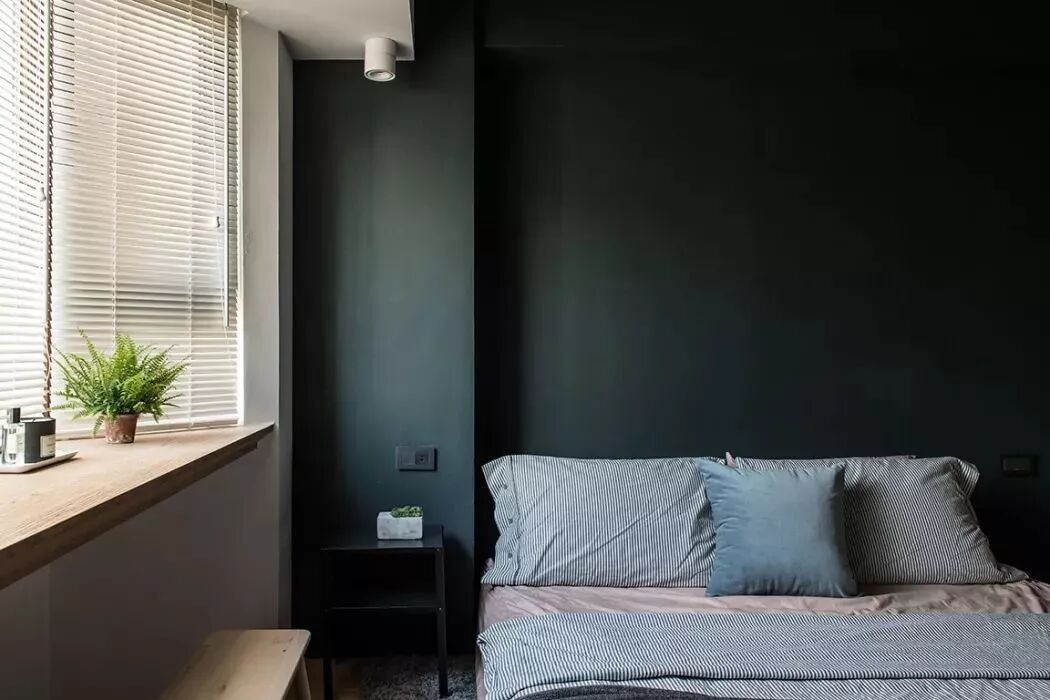 ▲卧室墨绿色背景墙,显得空间安静沉稳,引入百叶帘的光线和绿植,让空间不会显得压抑,带来了一丝自然的清新感。