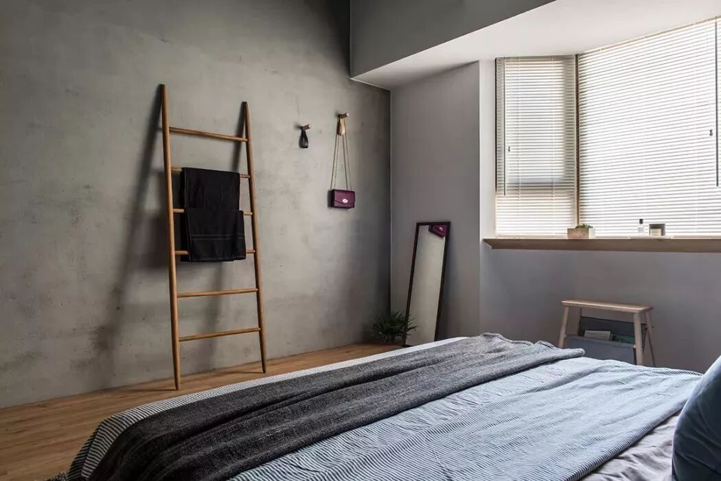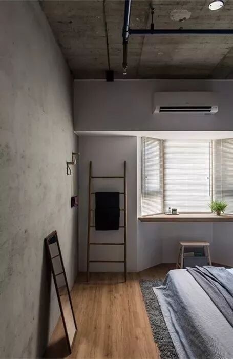 ▲床尾的墙面也是以水泥质感的三边型的窗户沿着窗台做了一个搁板,还可以作为书桌用,这样巧妙的空间利用,真心觉得棒。