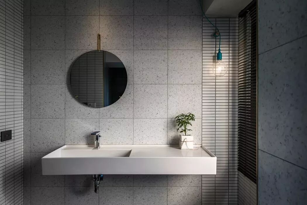 ▲卫生间整体灰色石米质感的墙面,装上一个悬空洗手盆,挂上一个圆形的镜子,装扮出一个简单而又充满神秘感的卫生间。