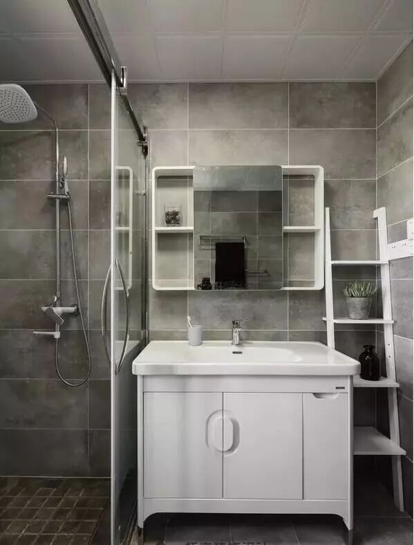 在上面安装一个隔板、毛巾架,或者干脆做成一个壁柜,将日常所需的卫浴用品分类摆放其中,取放非常方便,还能巧妙丰富空间层次感。