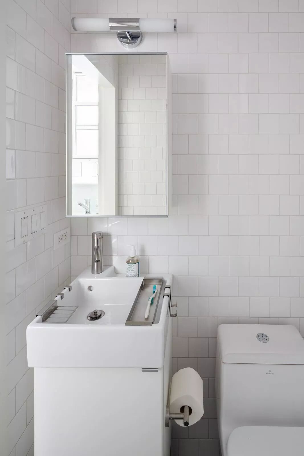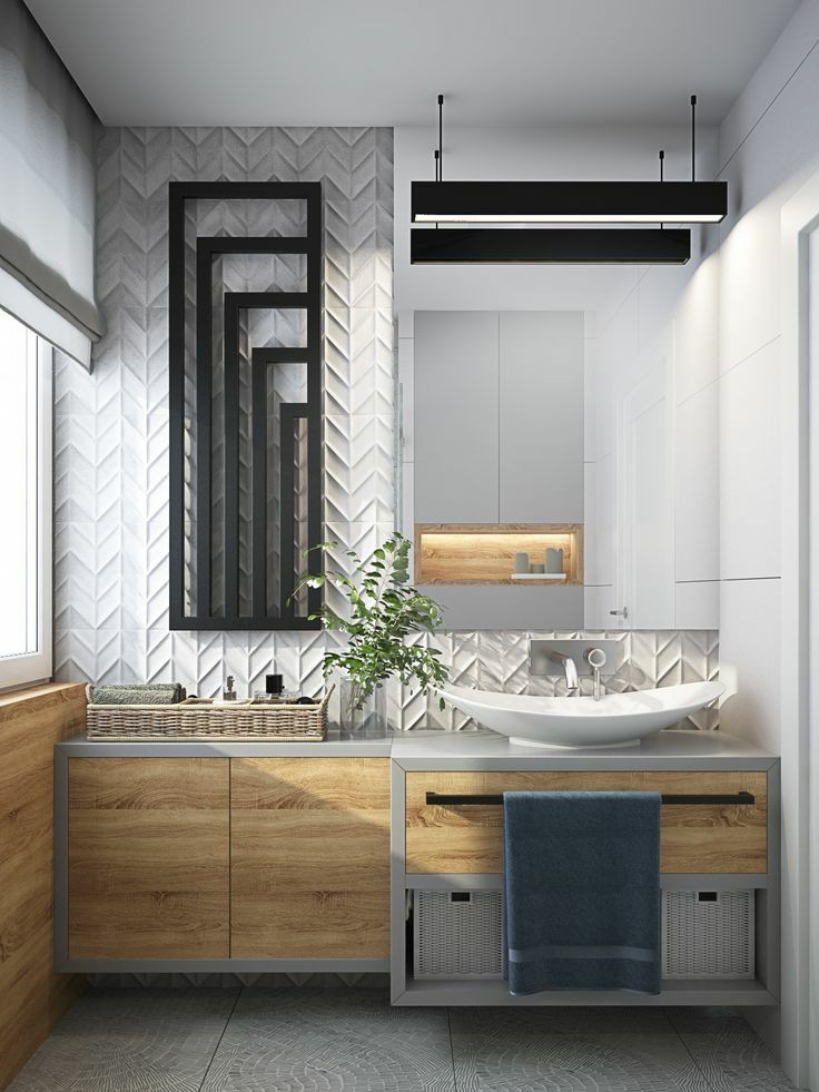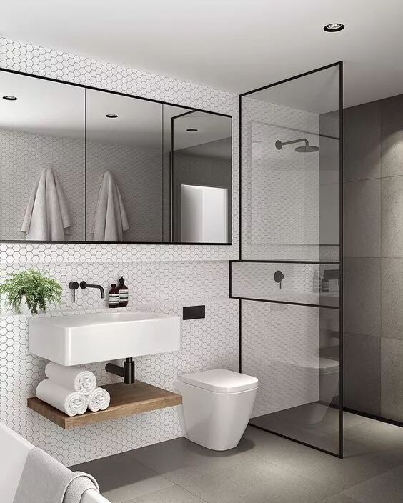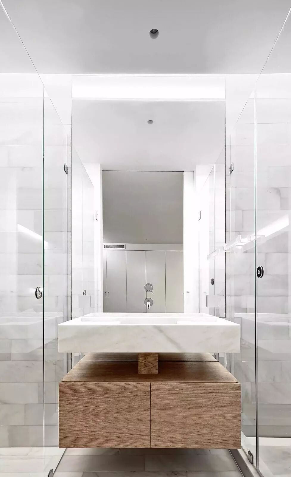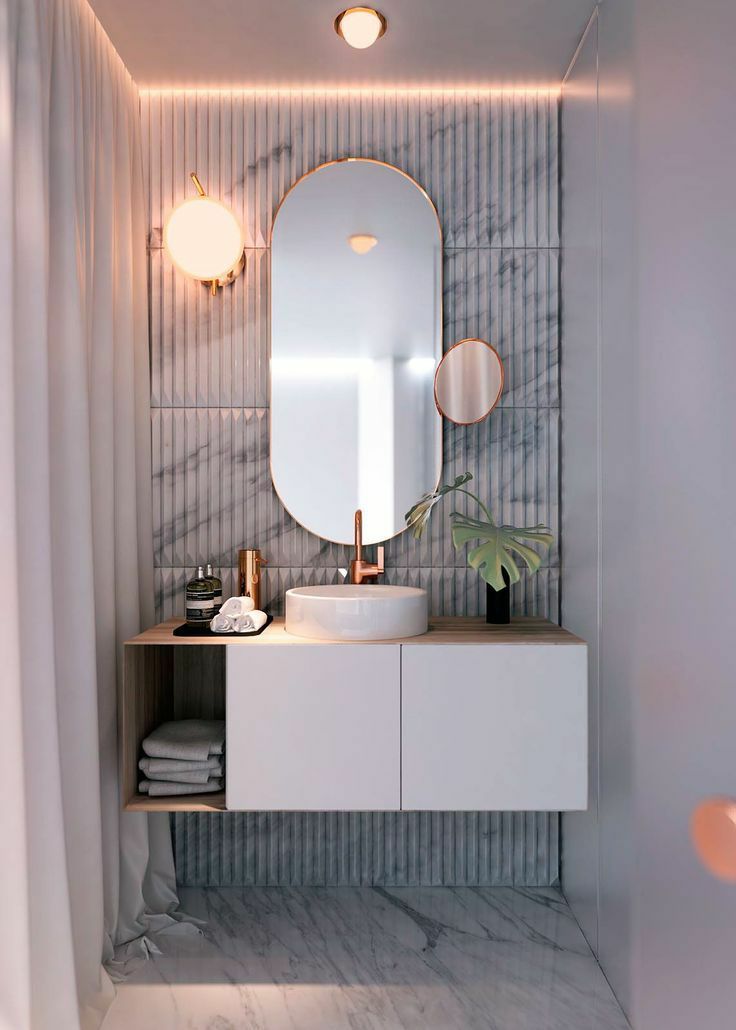 除此之外,大容量的镜面柜、嵌入式壁龛、简易隔板等,也能最大化地将立面空间利用起来,不但有效减轻了视觉负担,也令整个空间看起来更加干净利落。