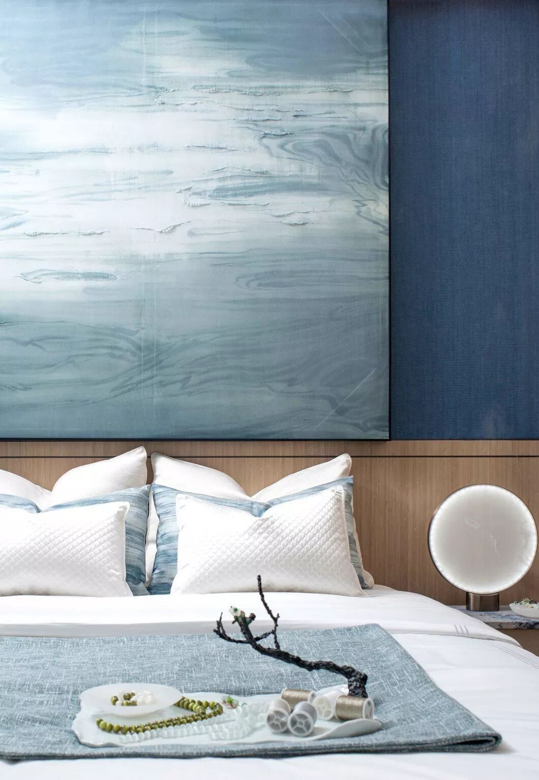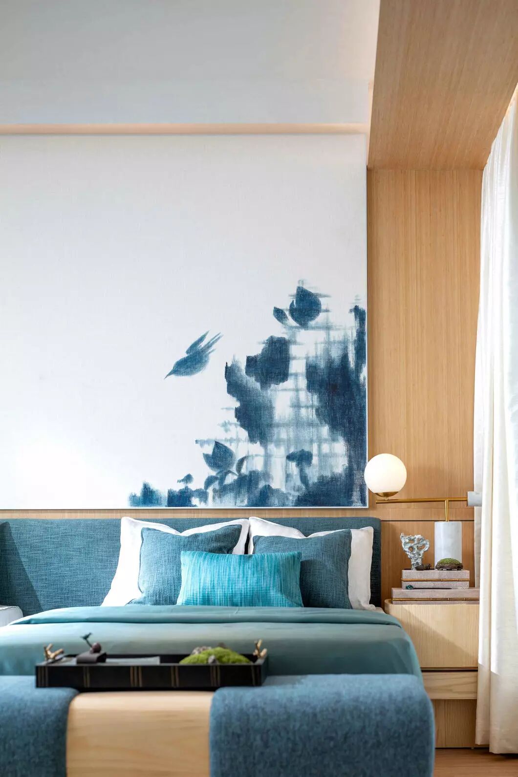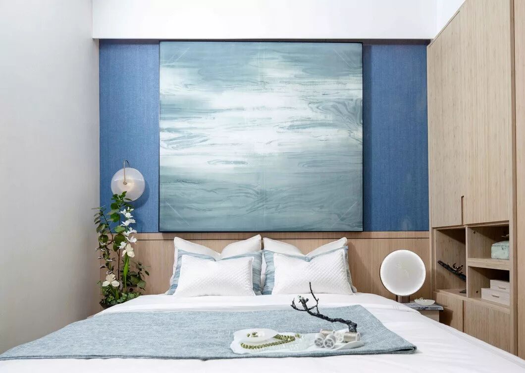 长辈房则以温润素雅的色调,儒雅舒展的线条展开,再搭配清新自然的色彩。留白的墙壁以青花点缀,展现东方之美。空间以素雅精巧的配饰装点,展现静默淡然,随遇而安的惬意。