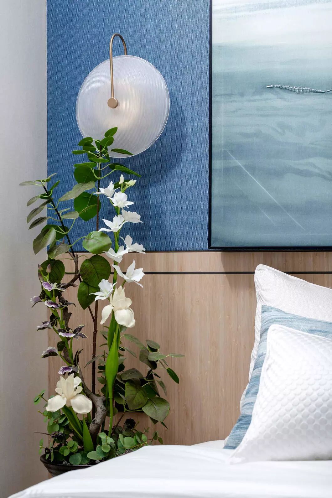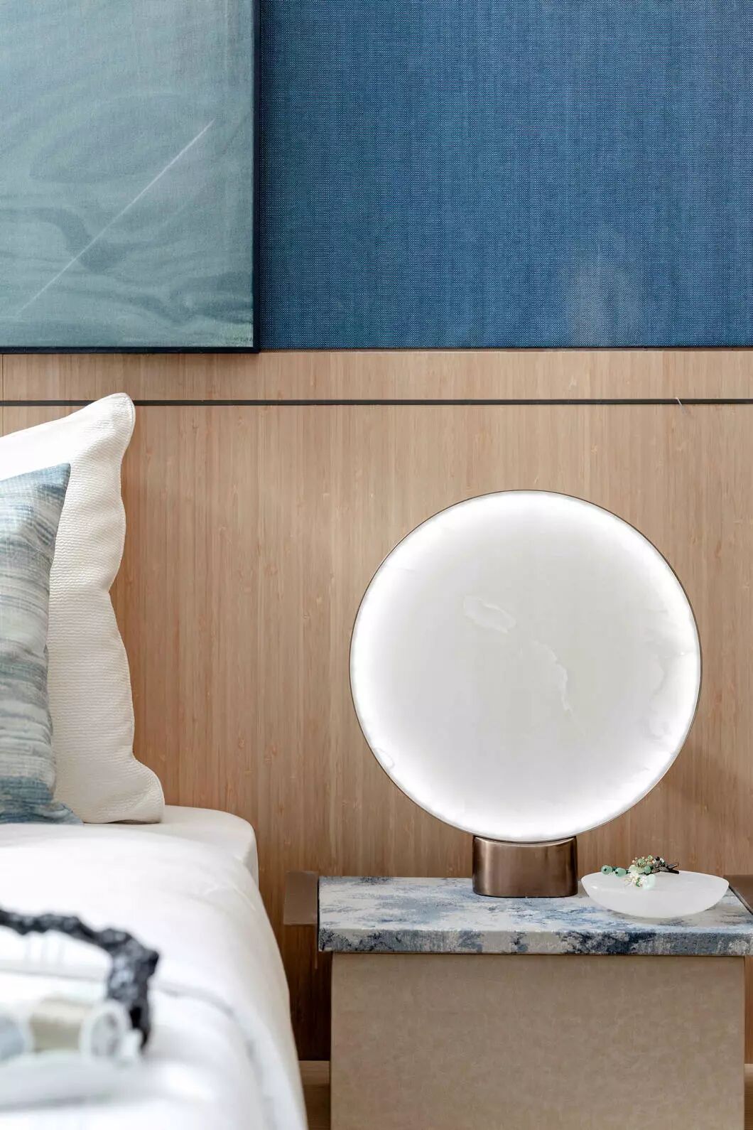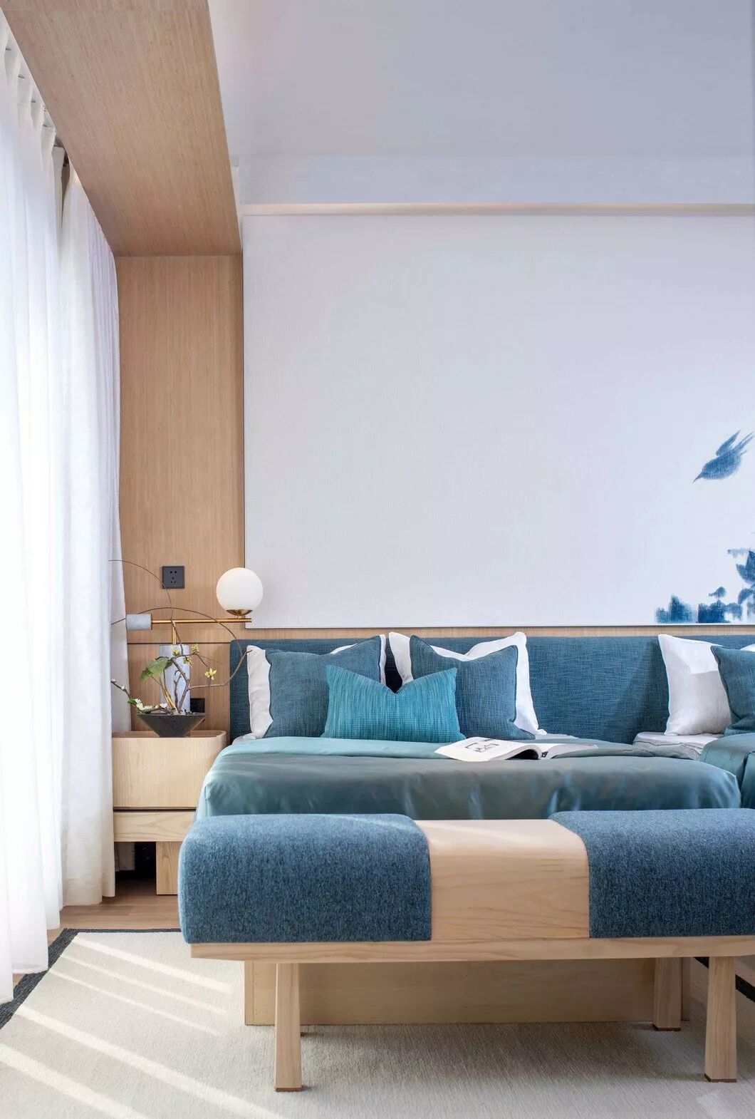 长辈房则以温润素雅的色调,儒雅舒展的线条展开,再搭配清新自然的色彩。留白的墙壁以青花点缀,展现东方之美。空间以素雅精巧的配饰装点,展现静默淡然,随遇而安的惬意。