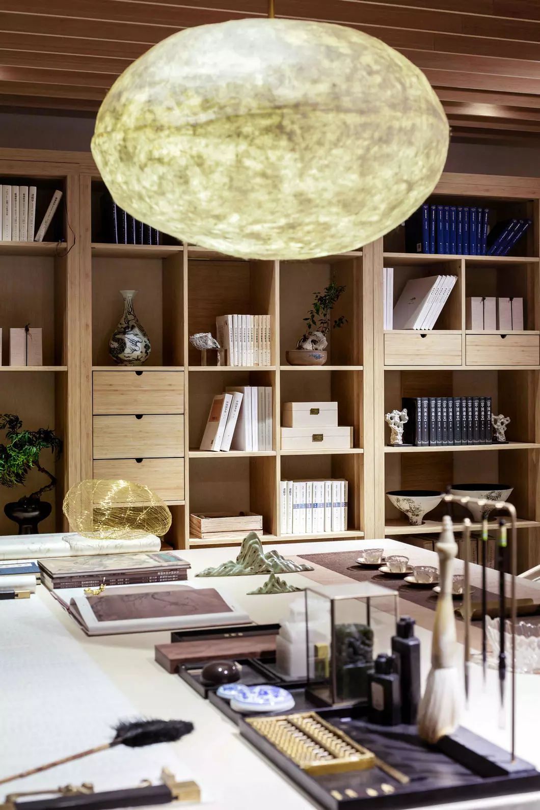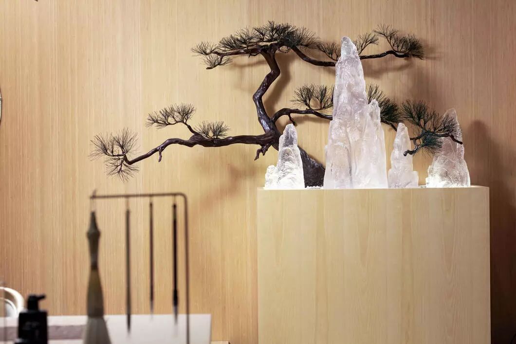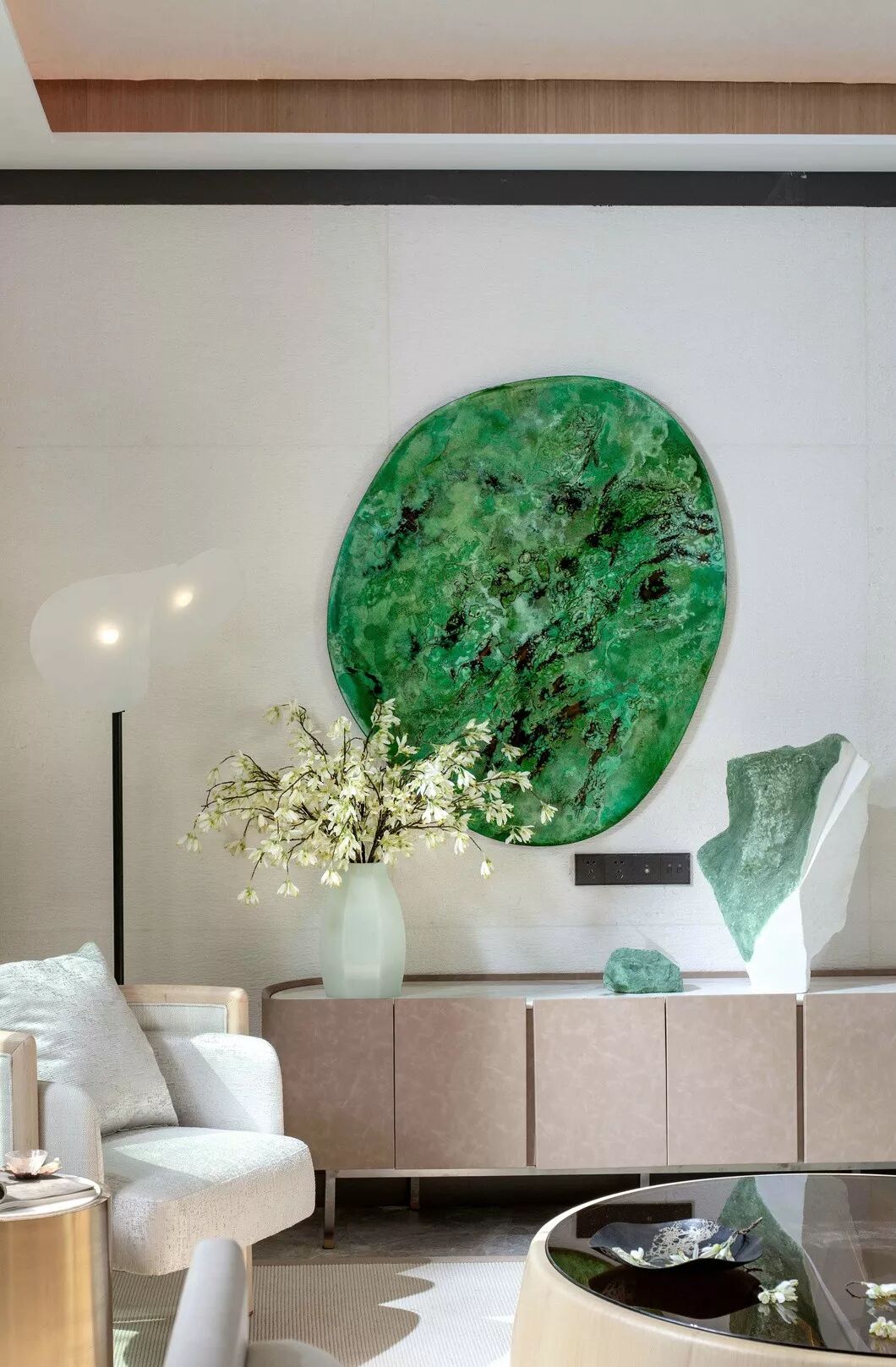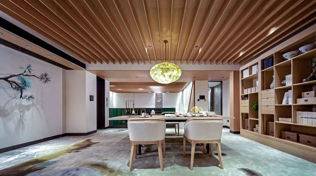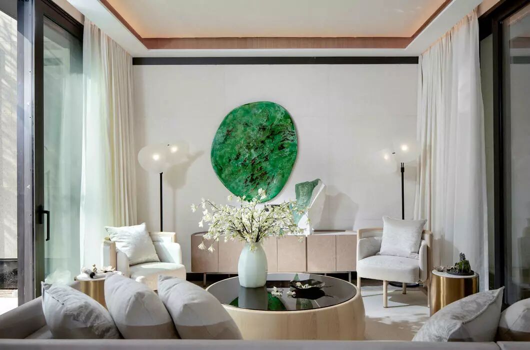 将浅木揉进荼白,再点缀几处翡翠绿,高度和谐的低调里却流露出再三斟酌的精致感。以传统的艺术脉络,通过细节串联了整个视觉空间。