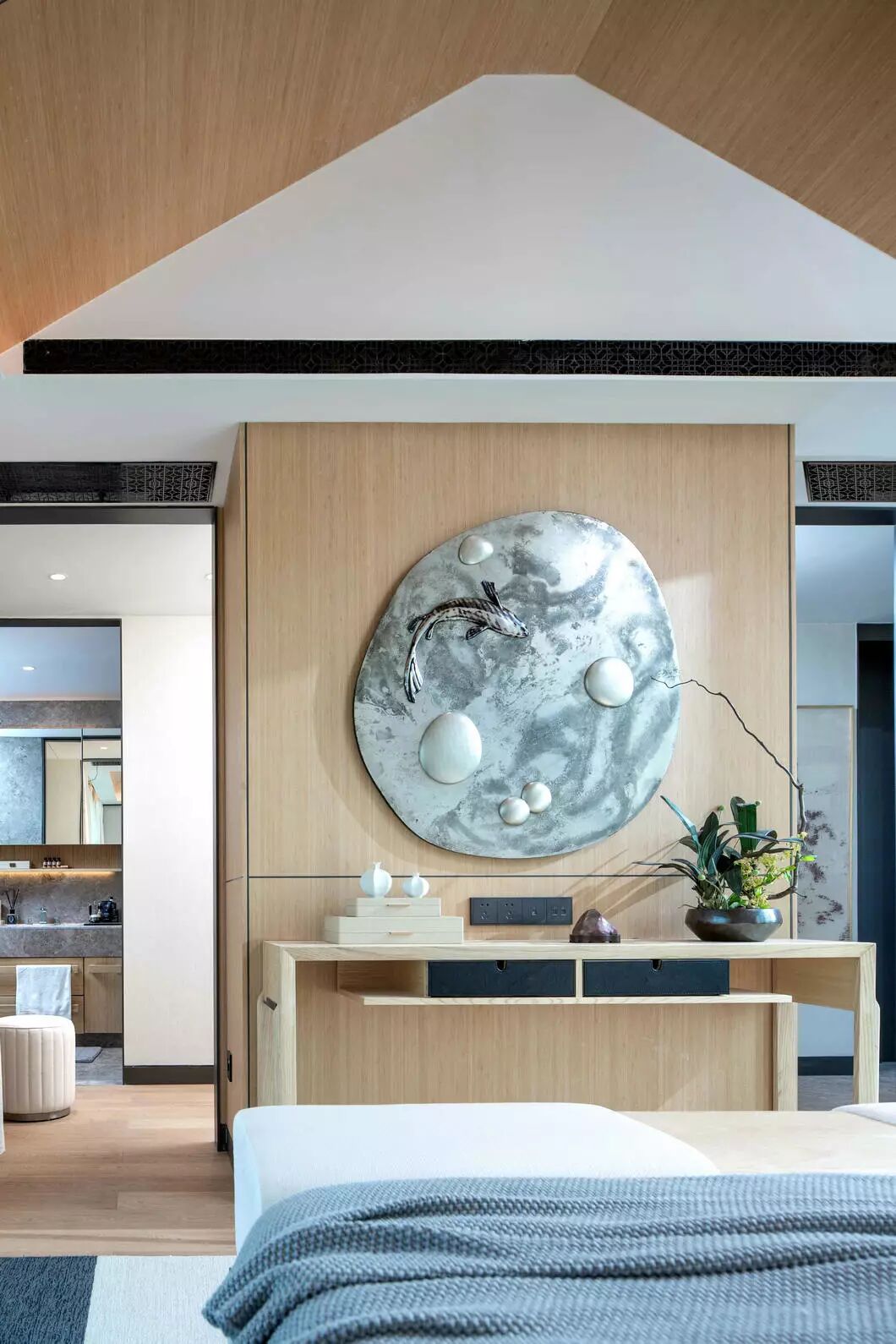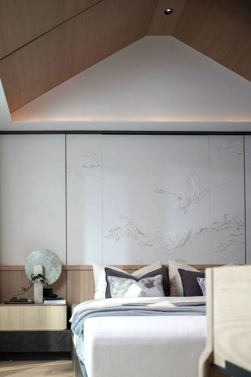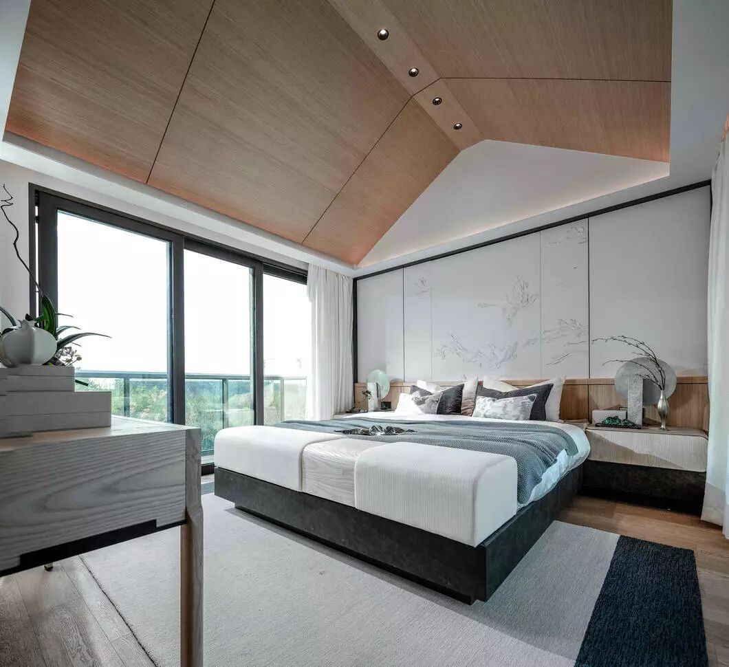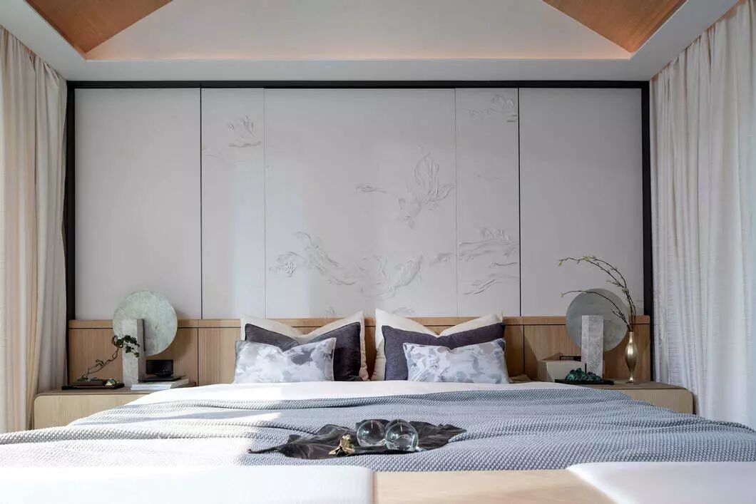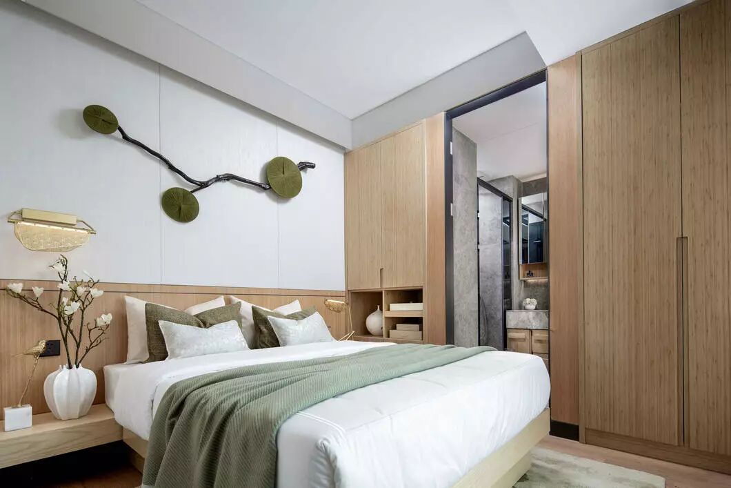 主卧是以线为枢纽,融入东方美学的雅致灵动,用原木的细腻刻画出空间的温润与澄静,运用朦胧美学营造出当代人文雅致。