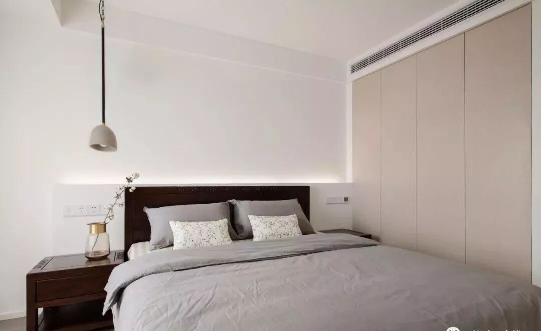 ▲衣柜的浅色门板,更适合年轻人,隐形拉手的使用,更是新中式风格的体现!