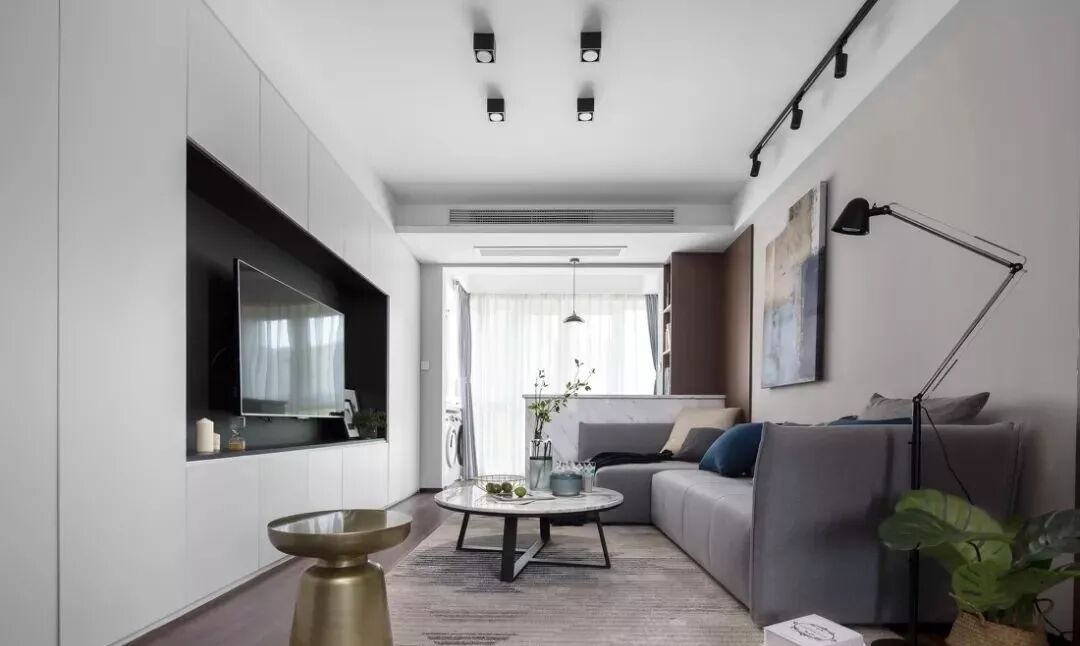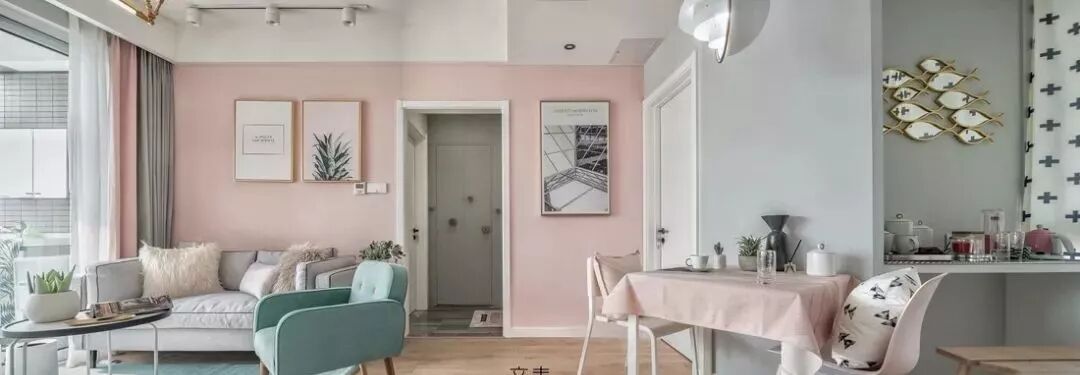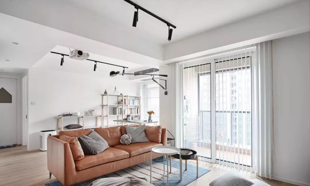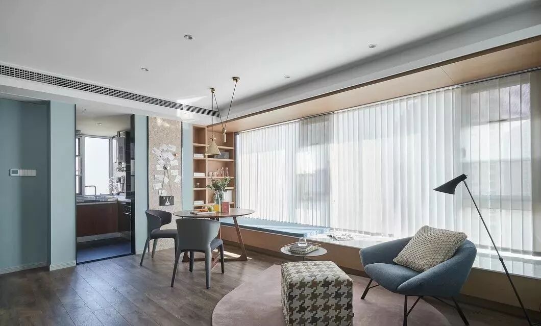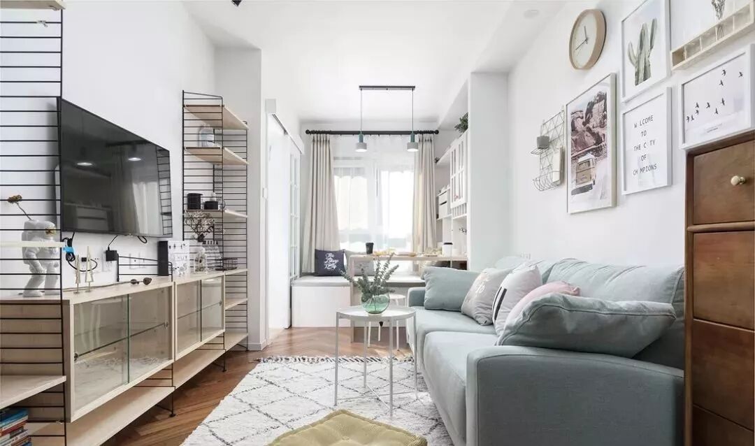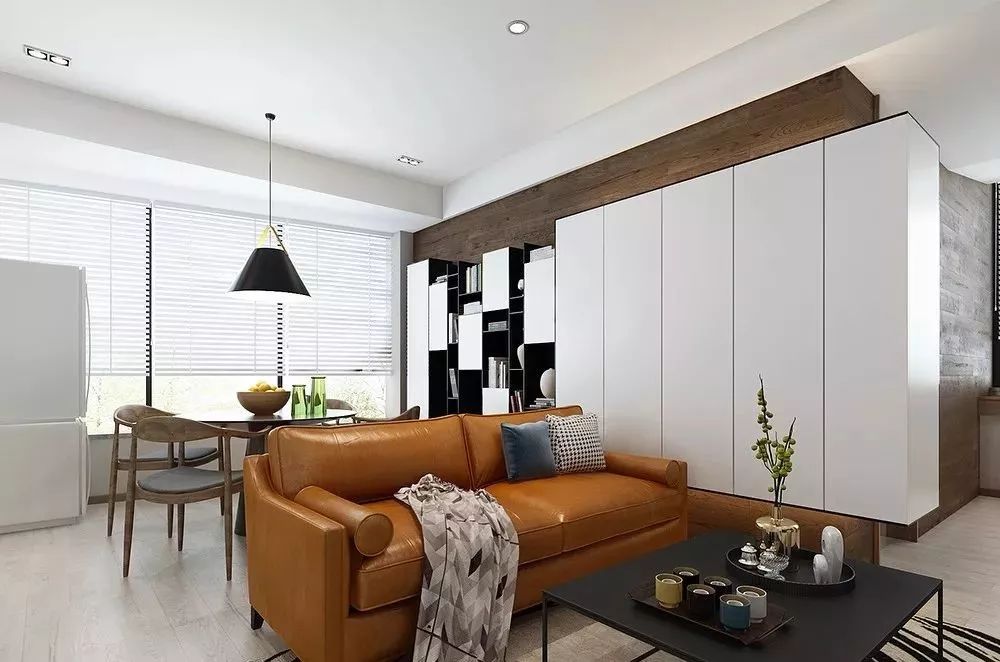 (60平米小户型的客厅拥有:客厅、餐厅、办公三种功能,麻雀虽小,五脏俱全。)