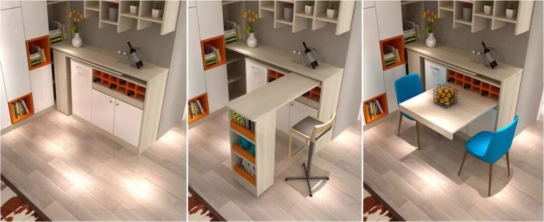 这个低调的角落边柜,可根据家人的个人喜好、划定区域进行搭配组合,变身之后可成为吧台、餐桌、书桌、调酒区、收纳柜等,达到多功能灵活应用的目的,甚至可以形成一个开放式的社交活动区域,不管是聚餐还是休闲互动,都游刃有余。
