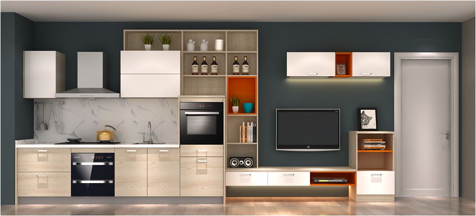 完全开放的厨房空间与客餐厅相融合,有了更多的社交与实用功能,无边界的创意,十分符合年轻人自由百变的即兴态度。一字型的厨房+电视柜组合,加上不对称的结构设计,在充分利用空间的同时,让实用及美观都得到了独特的定制魅力。可一边享受影音娱乐,一边伴随着节奏营造生活气息。