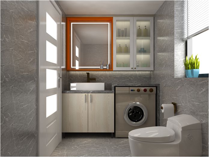 卫生间无需过多繁复设计,悬挂式的白色卫浴柜镶嵌上玻璃门板,舒适洁净的效果立刻就显现了。橙色的边框让卫浴镜成为视觉聚焦中心,智能感应全面照明镜,还可以显示天气、温度、时间等。镜柜右侧可放置洗漱和化妆用品,底柜的设计给了洗衣机一个安全的“家”,左下储物柜有效收纳家庭杂物,让空间更显整洁,兼顾了美观和实用。
