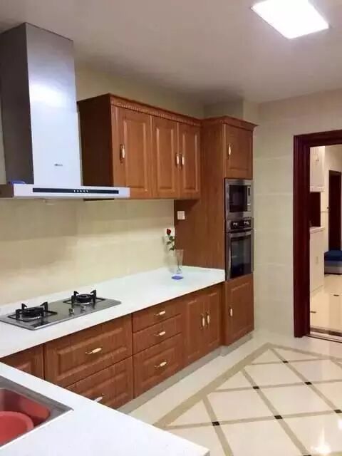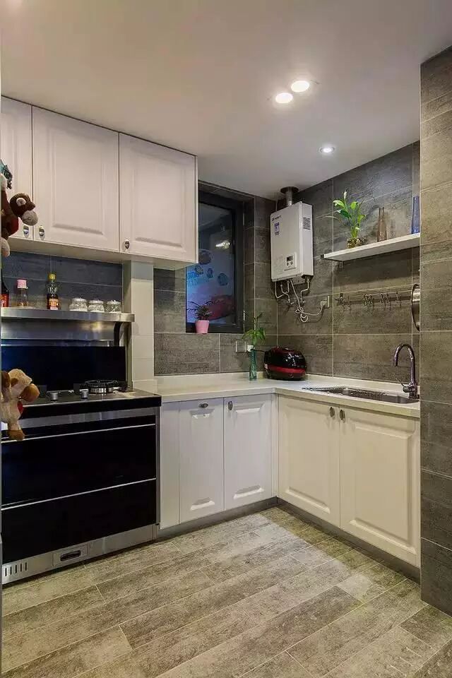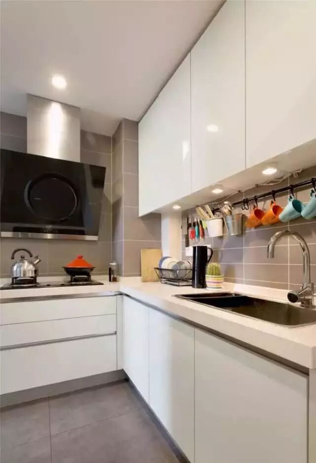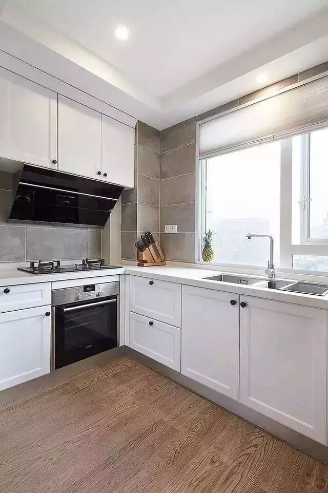 橱柜会根据厨房来设计布局,L形是最常见的一种。如果厨房空间不大,就要考虑是否把冰箱放在厨房。灶放在烟道附近,距离水槽之间的区域,是操作的黄金区域。