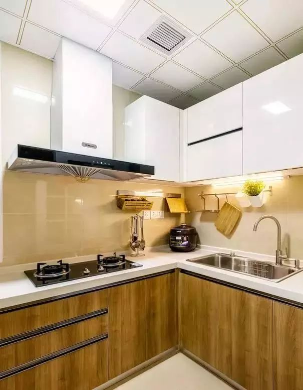白色和木纹的组合厨房,适合现代、北欧等风格。隐形拉手更简洁。
