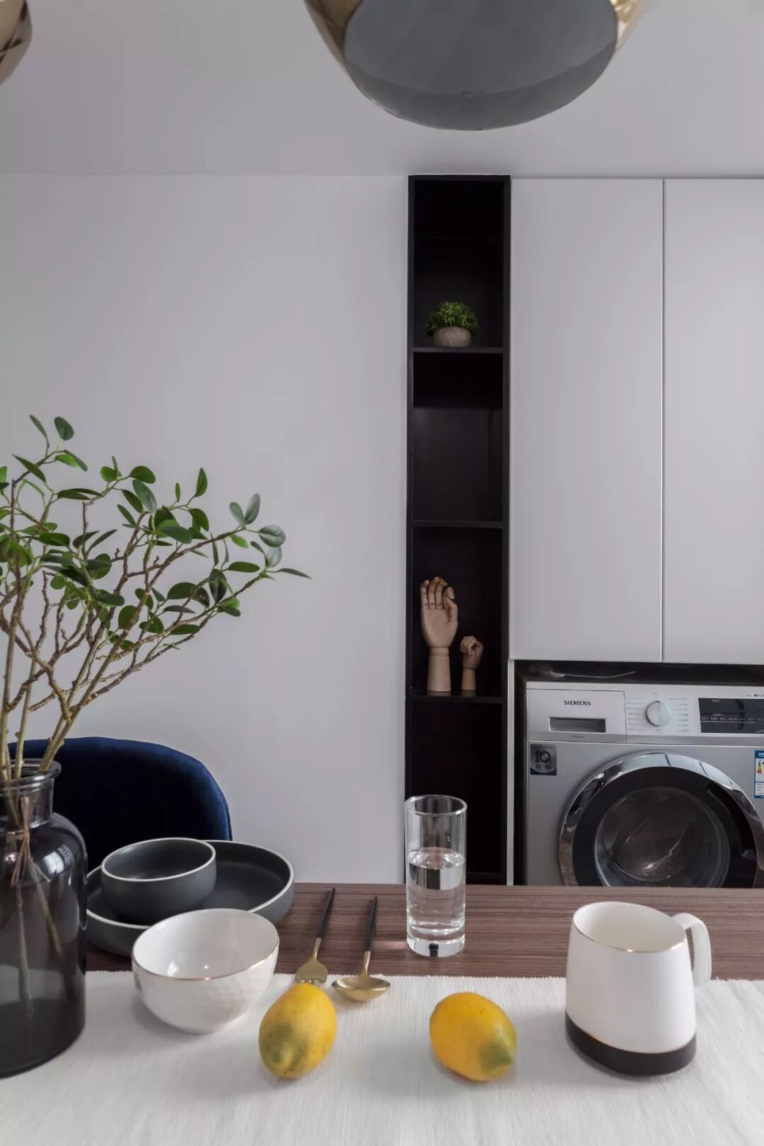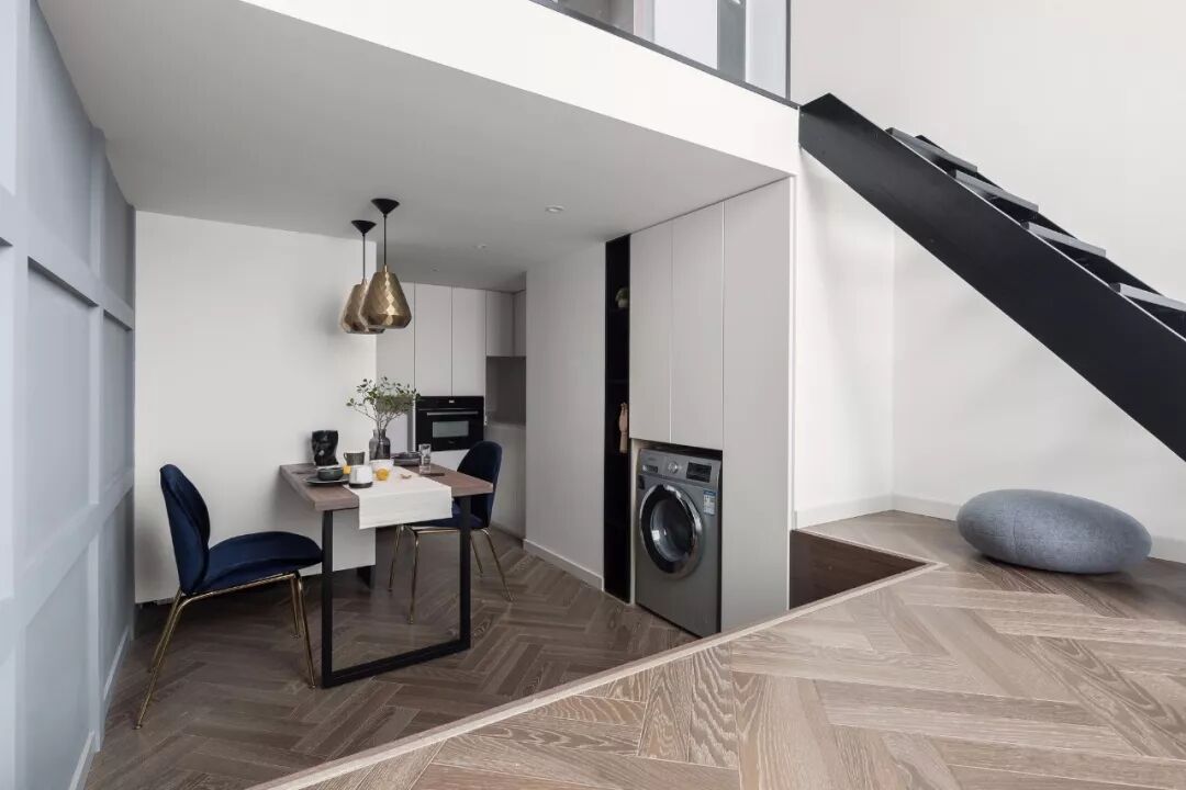 餐厅的空间,兼洗衣区。餐桌的构造是咬合了一部分门厅柜体,一头便已有了固定点,另外一头只需要添加一个支架即可。洗衣机被塞到跟楼梯同宽的柜子里。