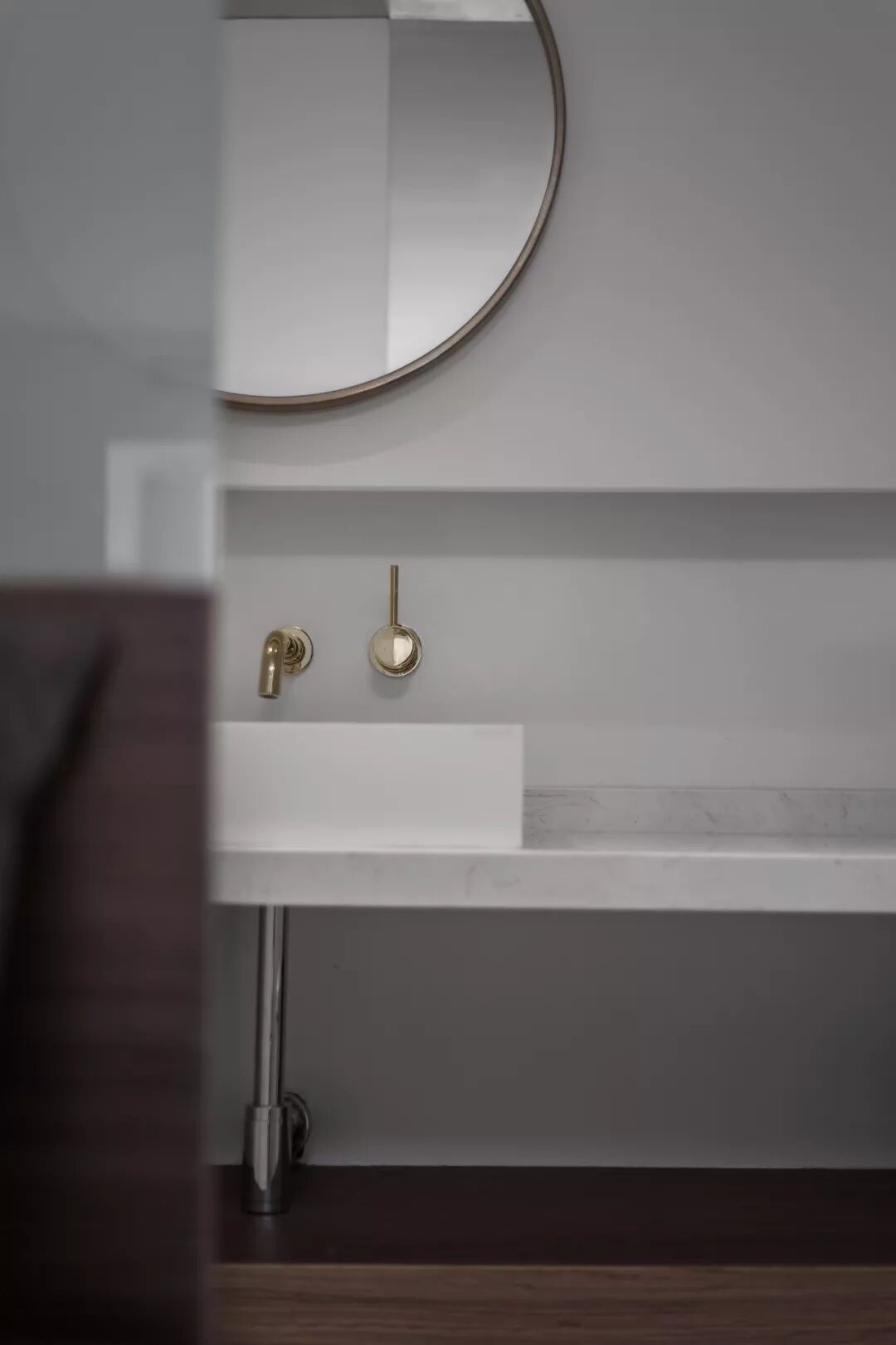 我们将原来的卫生间全部敲掉,在进门处我们并没有直接纵观全室,而恰恰相反的是,在这样的小空间里,我们设置了一个门厅空间。通过一组到顶不接地的柜子,对空间进行分割。这样做的原因是房子门外相邻走道,同层有办公,居住,整体的人员比较杂乱。
