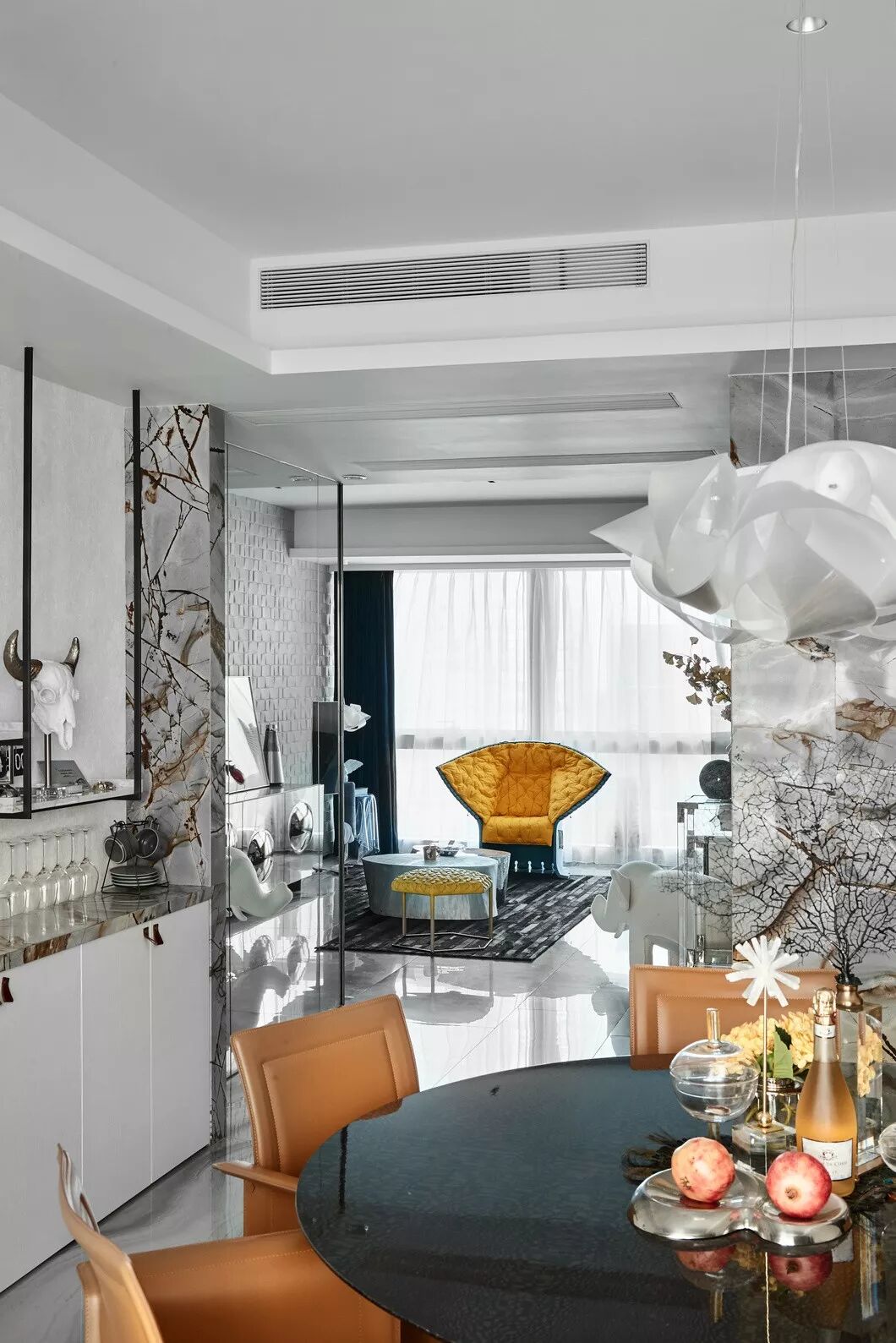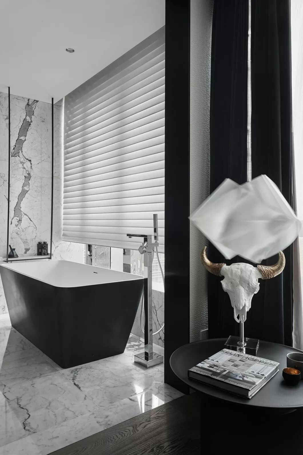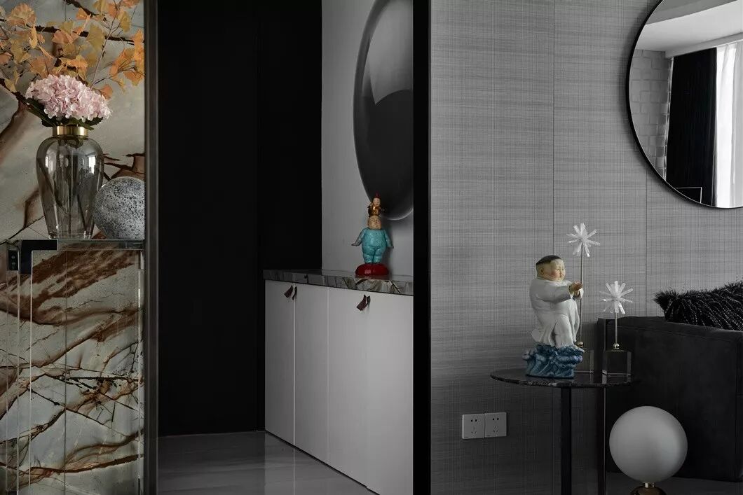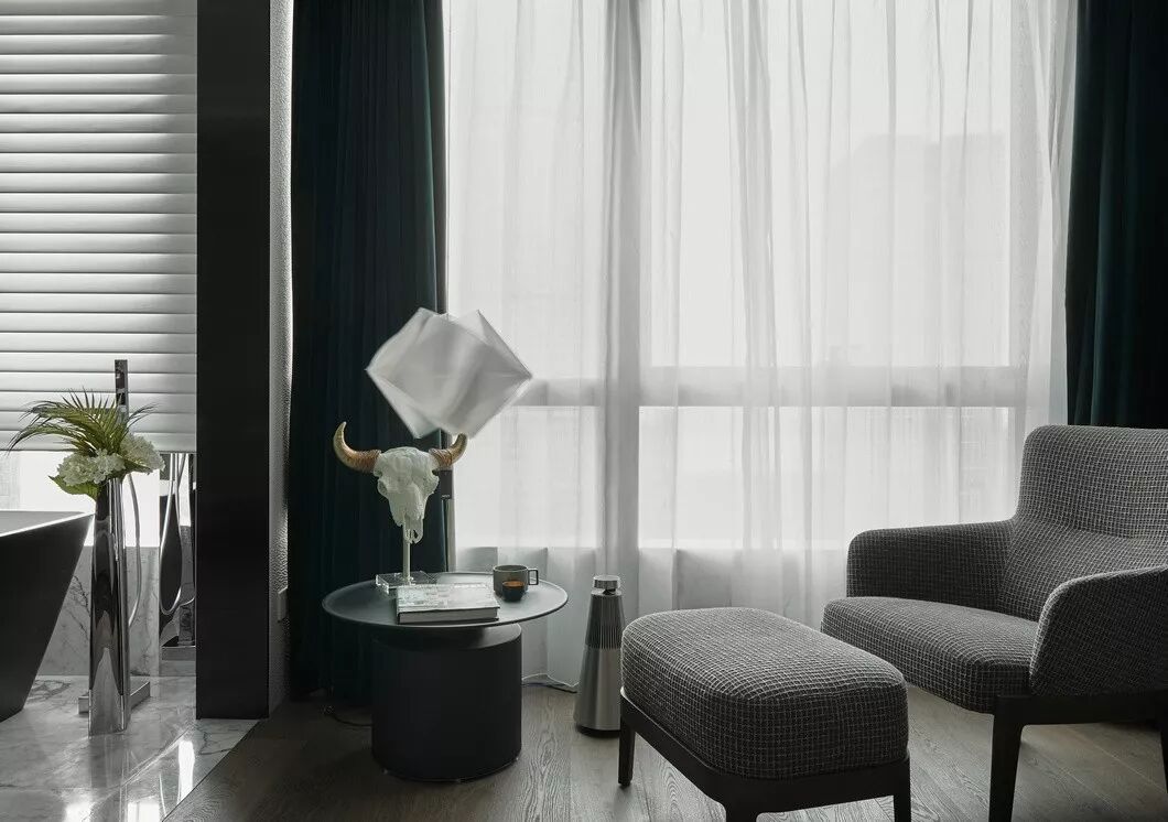 设计的初衷是将空间打造成居住和样板相结合的高端住所,要服务于人,首先要体验于自身,因此一开始便决意加入各种智能系统及进口品牌家居。色调则是以黑白灰定位,并未强调硬性的风格,所有家具软装皆是后期随搭随行,最大程度满足了男女主人所想兼可得的“任性妄为”