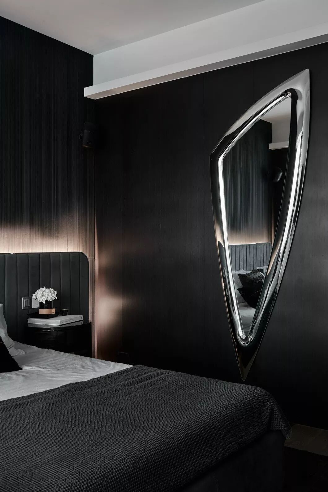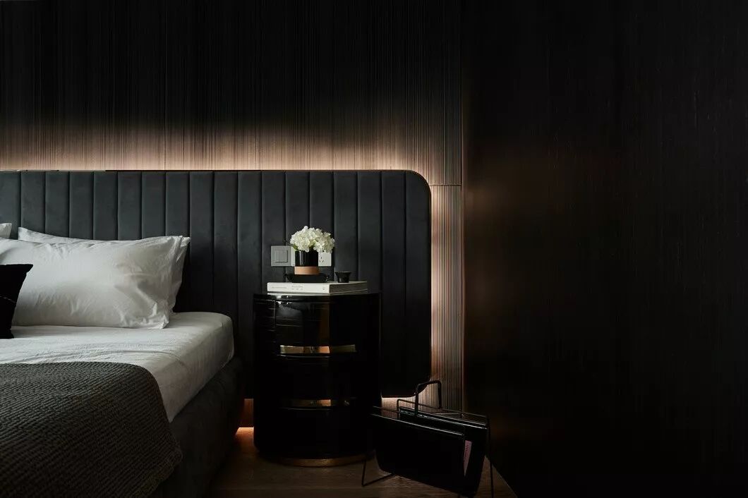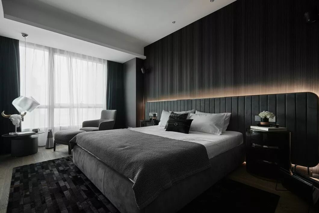 主卧以黑色为背景,加入了男主人惯用的不锈钢、大理石和玻璃材质。