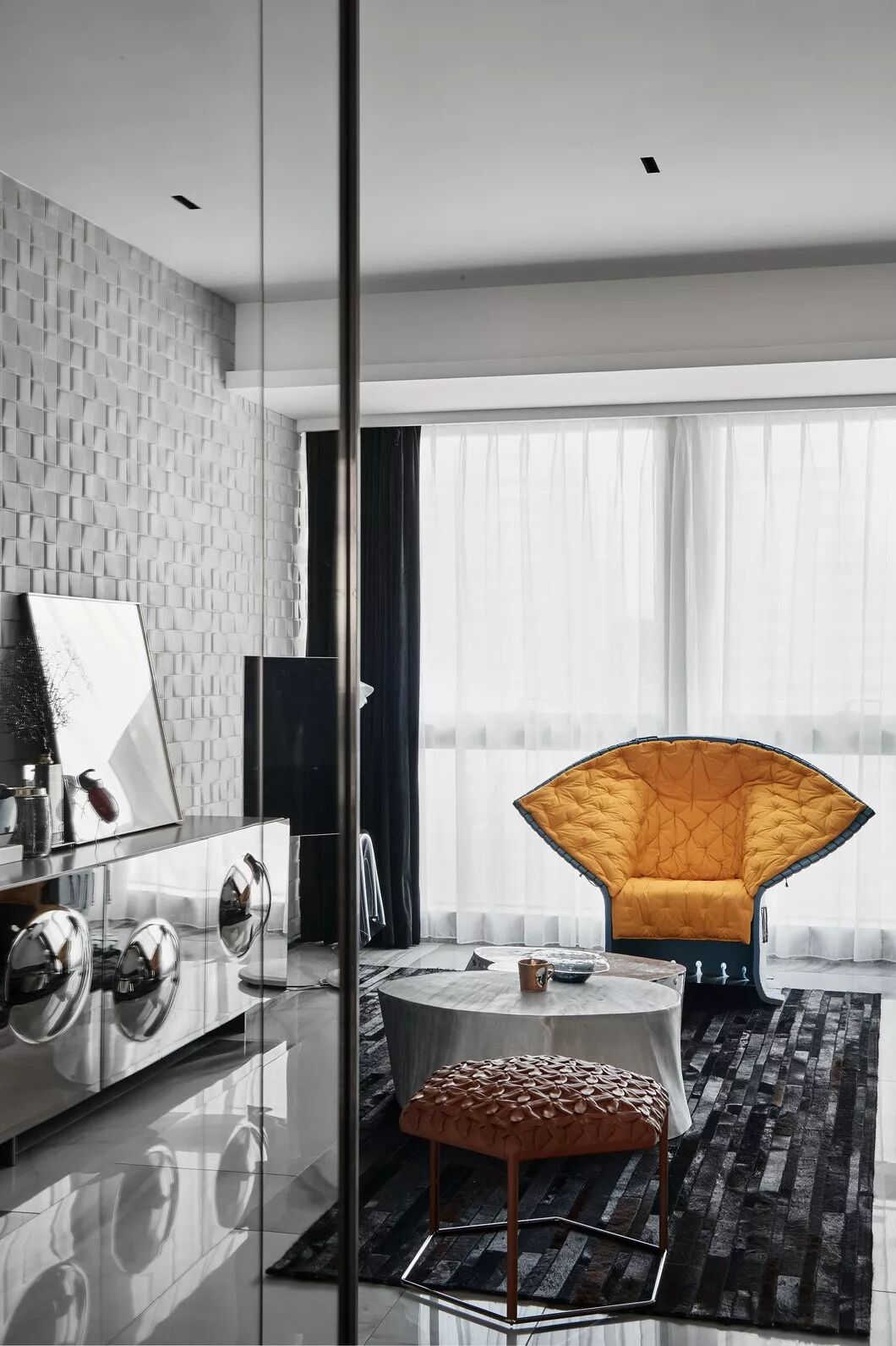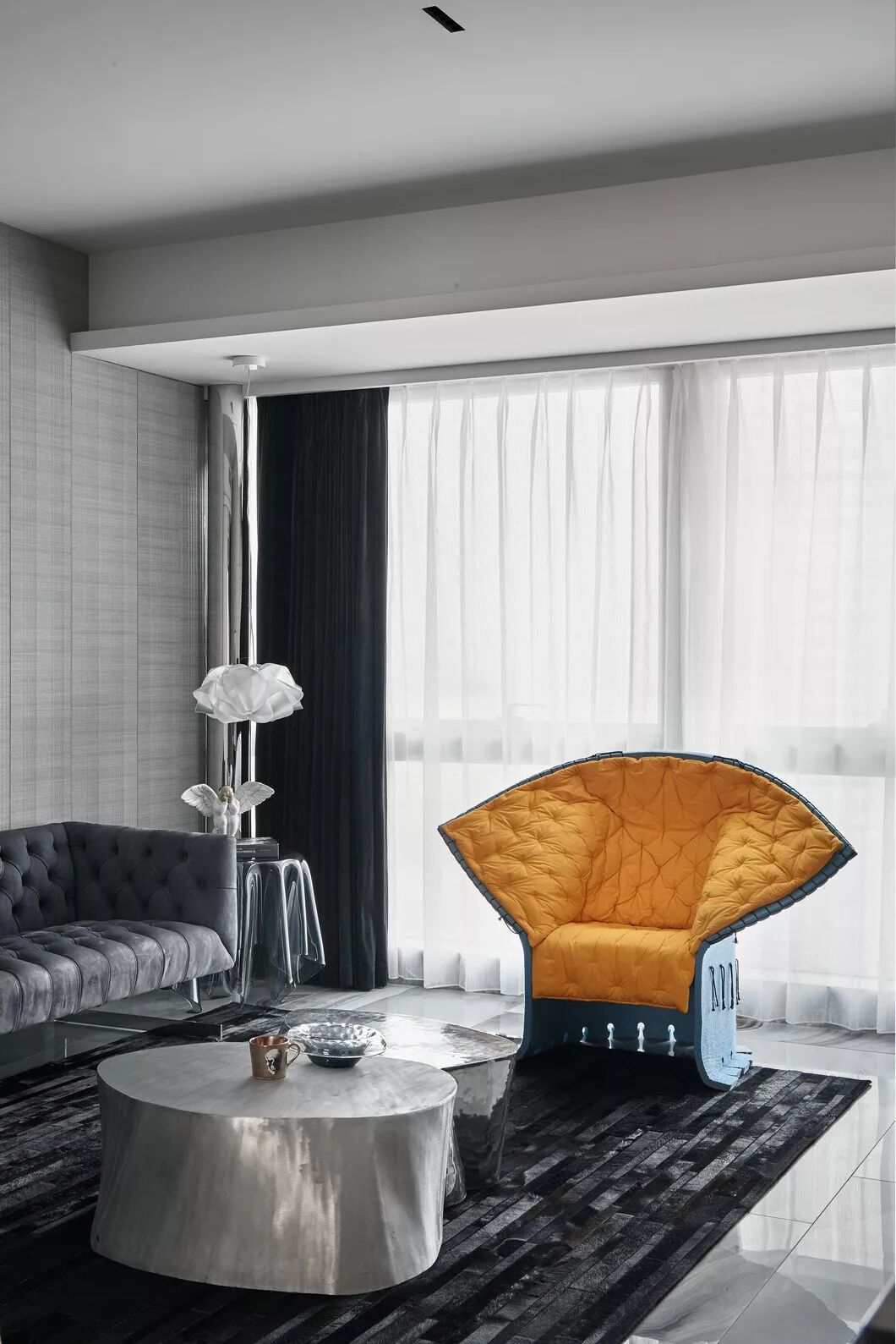 而客厅的重点突显在家具软装的品质在空间中的重要性。黄色Feltri 扶手椅是整个空间不安份的元素------淡然恬静的内心也会有跳跃的灵魂。然而,这张由当代设计师Gaetano Pesce于1987年创作的椅子,造型舒展,仿佛向人张开双手,发出邀请,落座瞬间,又有种被温暖环抱,拥有自己一片独立私密的小天地的体验。