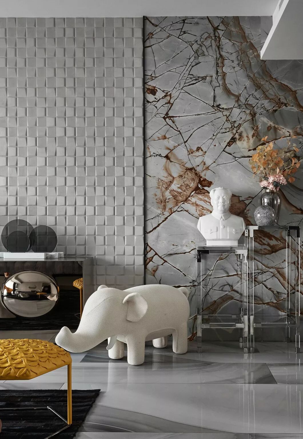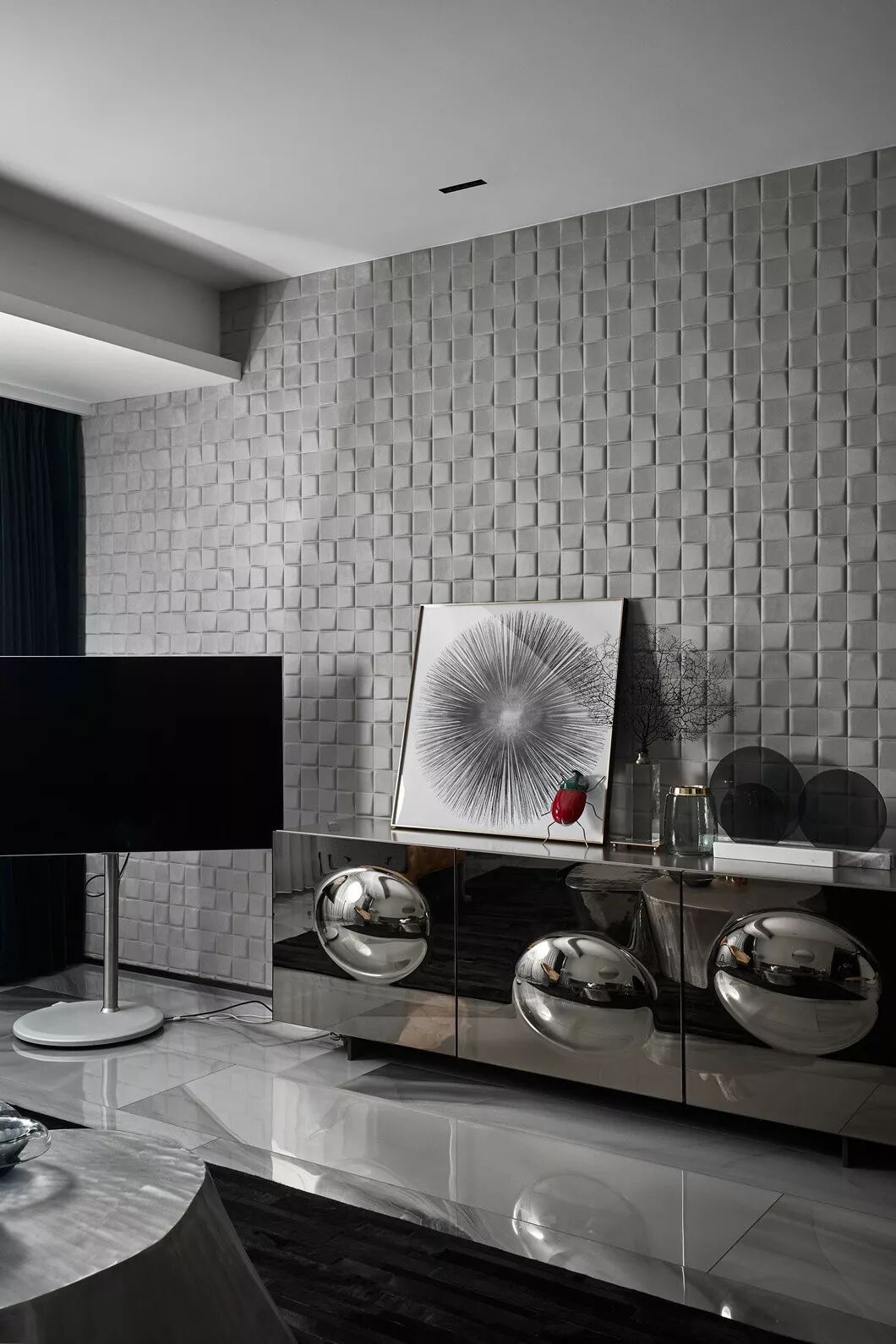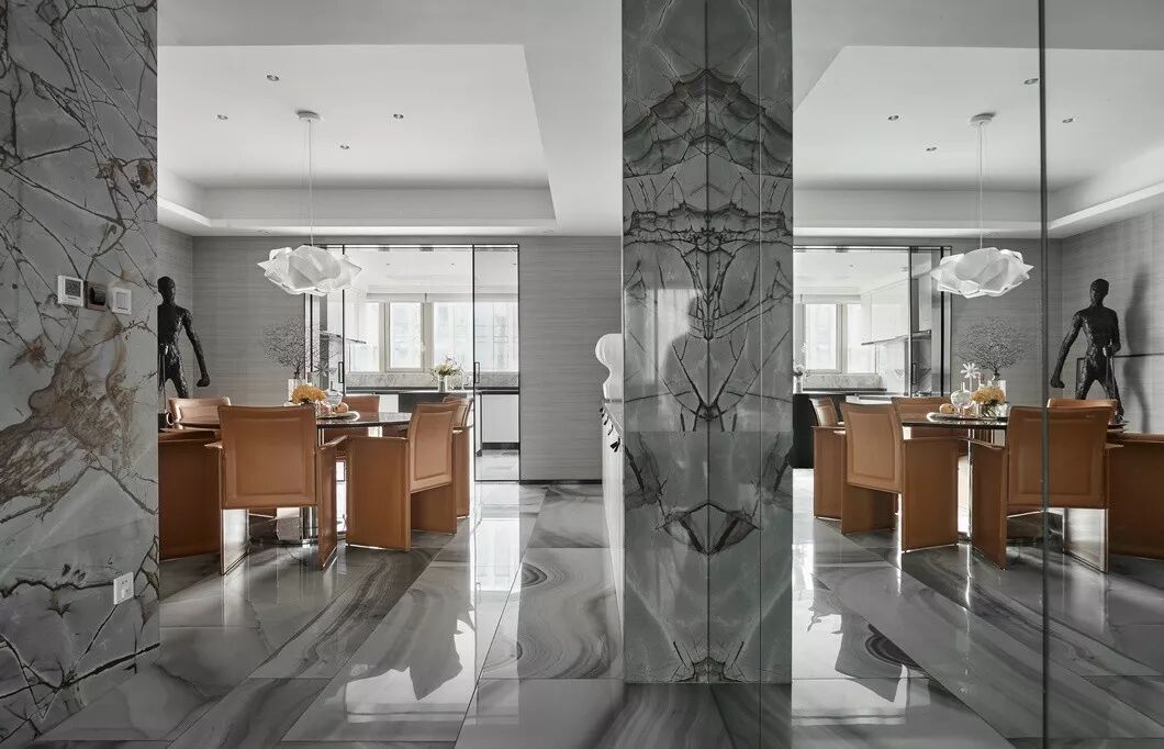 客厅的硬装极为简单,并无多余造型修饰,立体感的墙纸和花纹奇特的大理石是唯一的亮点。