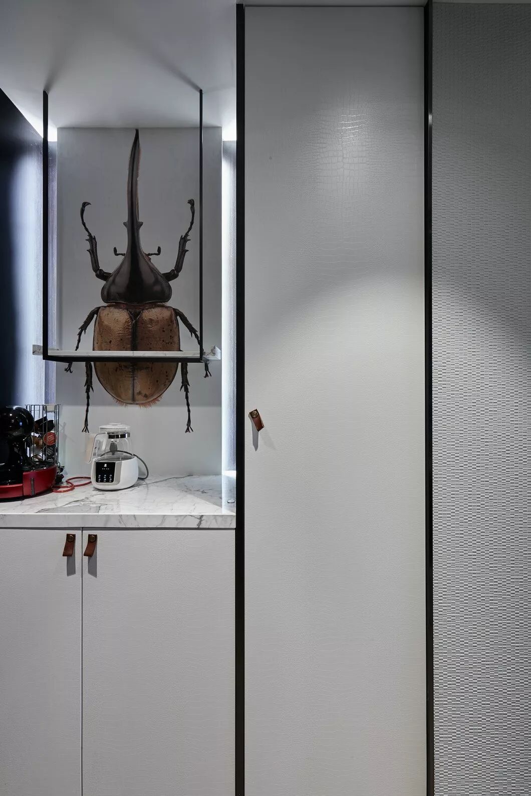 这个多功能水吧的巧妙设计解决了起夜喝水以及小朋友泡奶等问题,并且在柜子里嵌入了小冰箱,方便在主卧这个私密空间里让每一次休憩都可以无所顾虑。