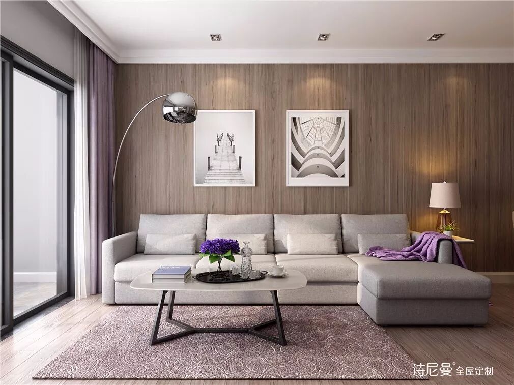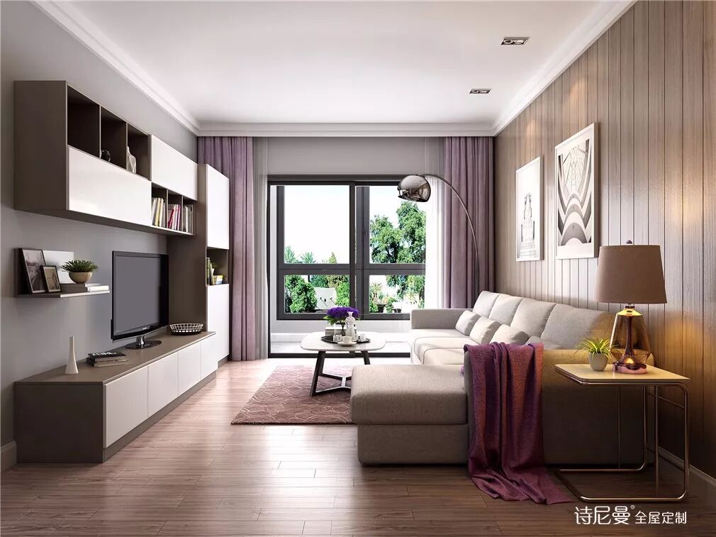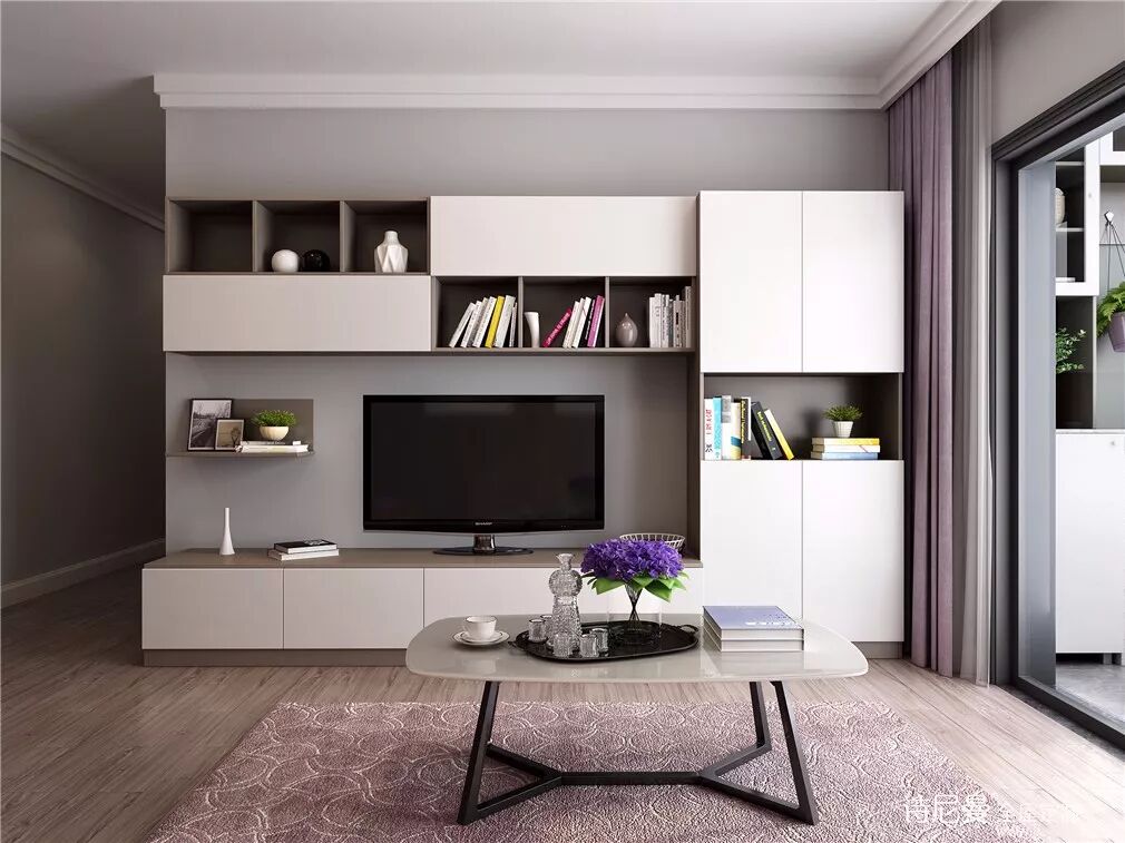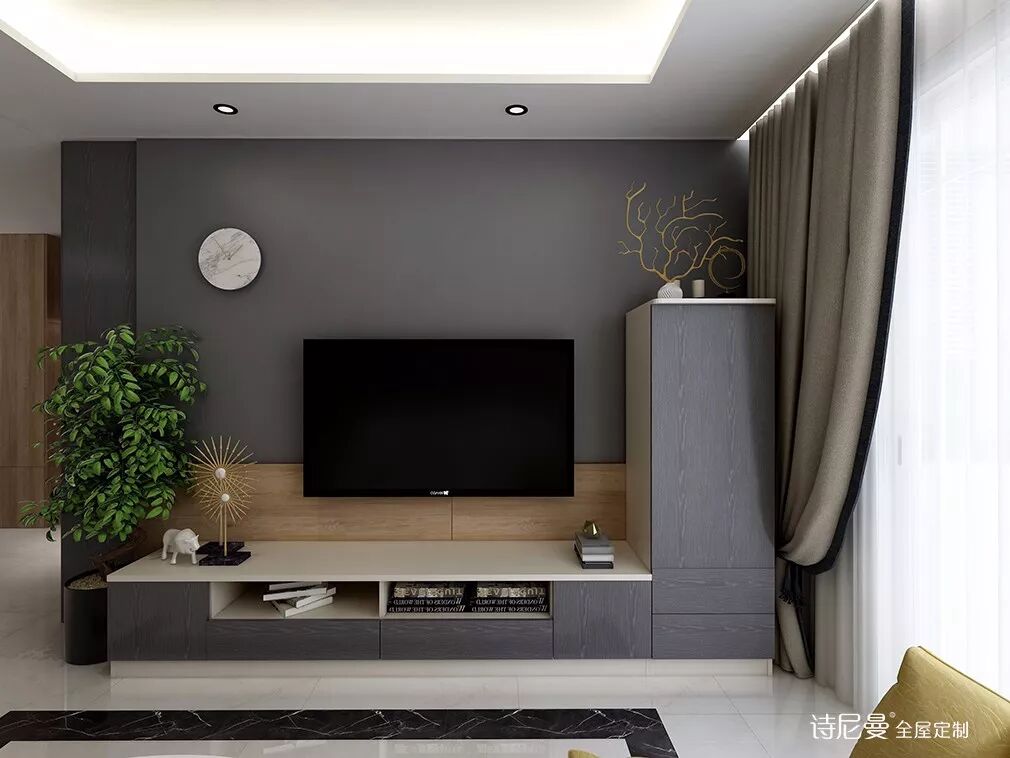 L型电视柜没有多余装饰,跟同色背景墙搭在一起就很有感觉了。