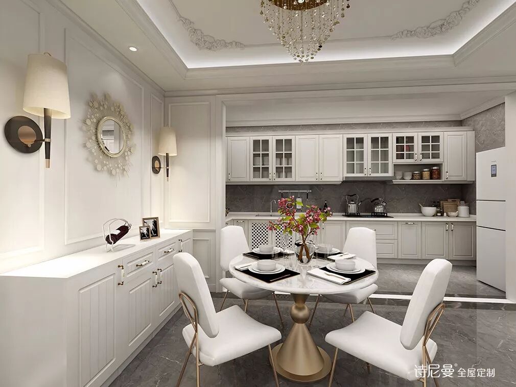 餐厅连接开放式厨房,纯白欧式柜子点缀黄铜元素,格调满满。