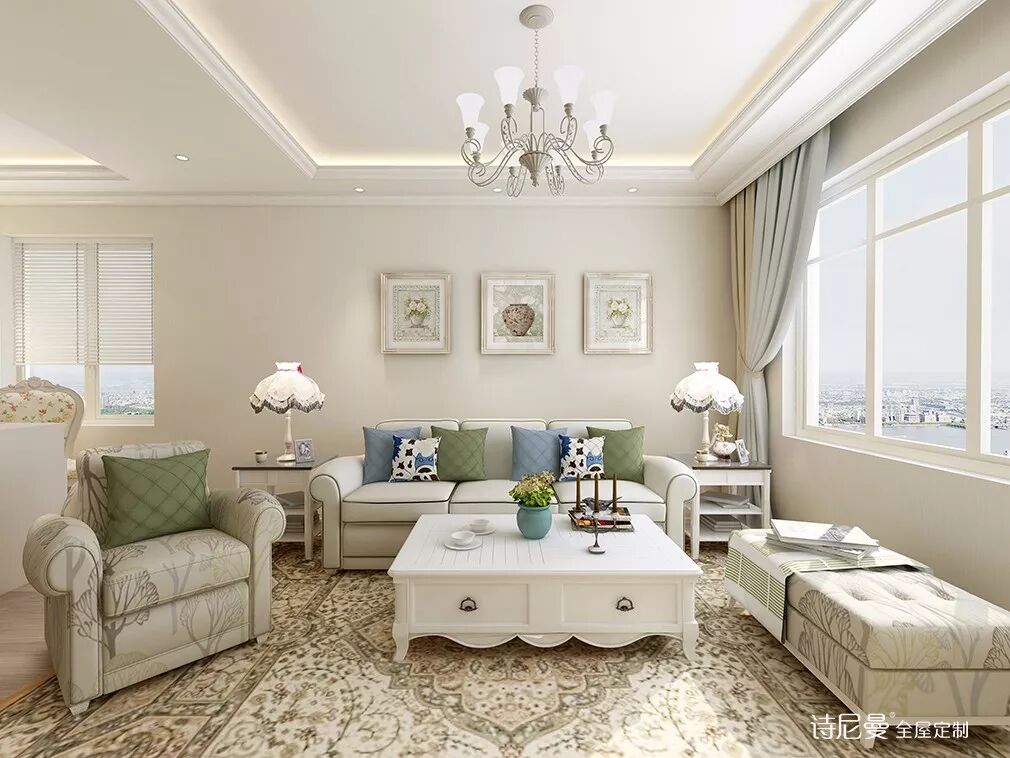 碎花布沙发、华丽花纹的大地毯、欧风灯罩、欧式风格的吉维尼系列柜子,清新又不显得小家子气。