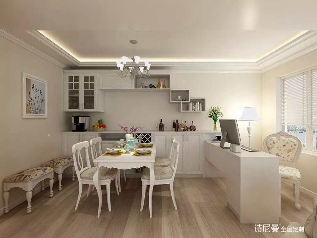 餐边柜靠窗的一面延伸出一个工作区,无论是加班、上网、阅读,还是孩子写作业都可以在这里进行,既不浪费空间,又能陪伴在客厅里的家人。