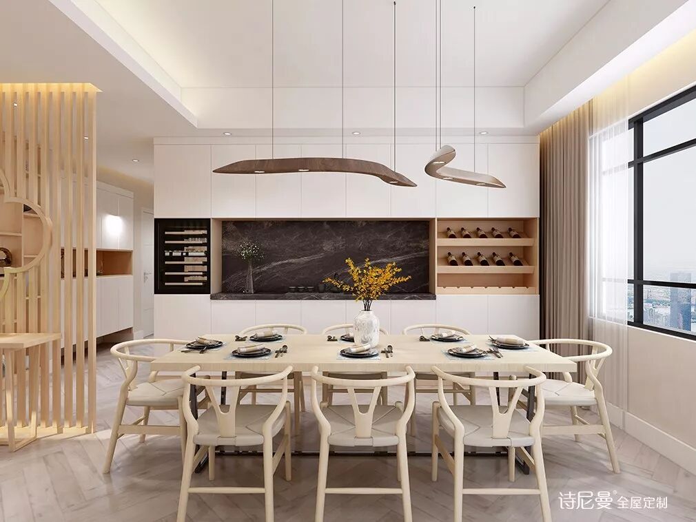 餐厅色调清浅,融合了古典跟现代两种风格的软装,大家庭适用的长桌,令进餐更有仪式感。