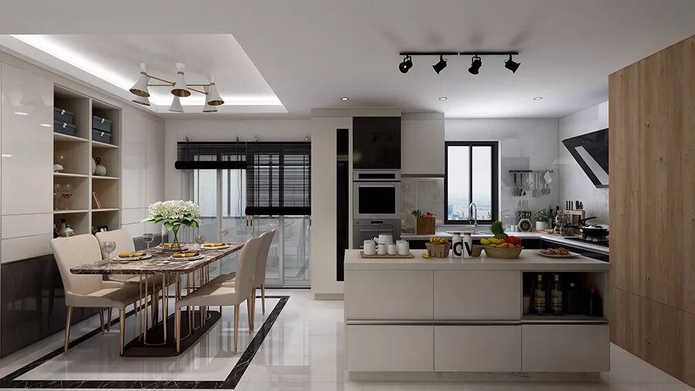 餐厨区则扩大了浅色调的面积,营造更舒适的用餐氛围,开放式厨房让一家人能够随时保持交流。