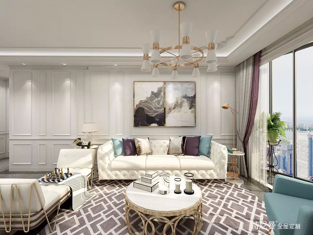 在欧式风格里,全屋纯白也是很具代表性的一种类型,整墙搭配欧式护墙板,华丽但不厚重,即使加上颜色艳丽的软装做点缀,也不会显得杂乱,反而更显华贵。