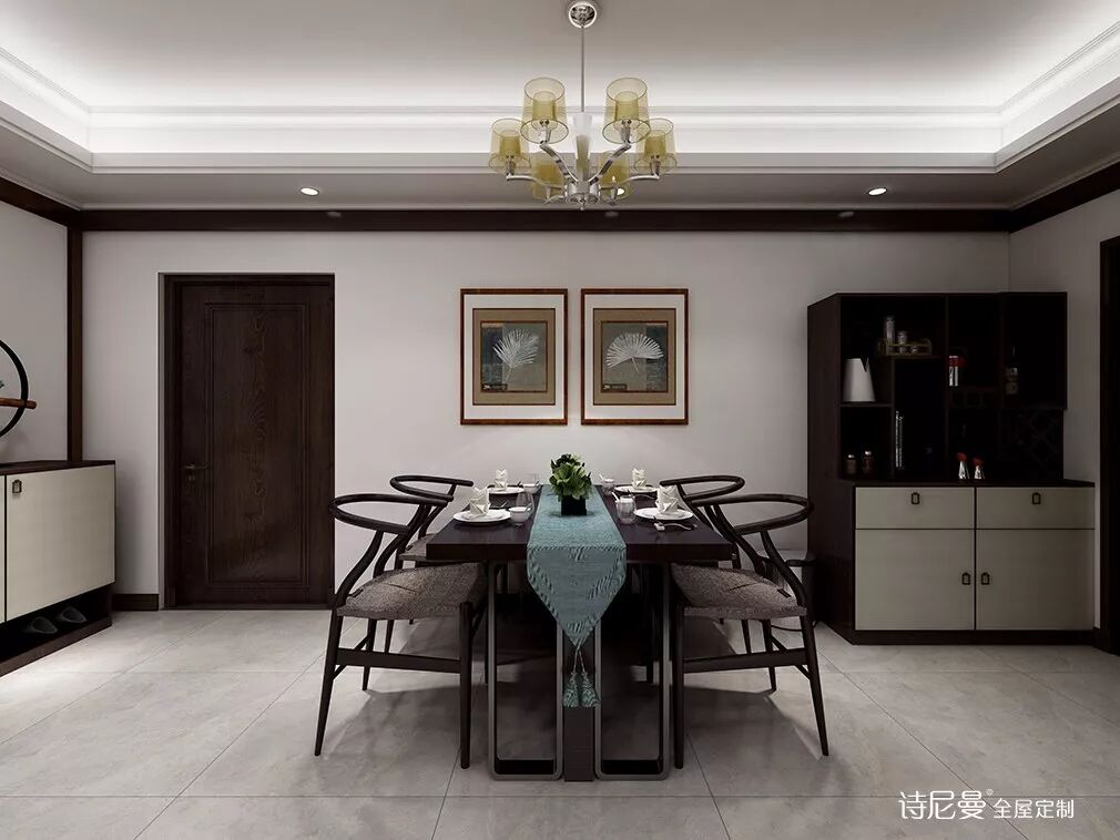 营造出这种氛围的,除了新中式的桌椅外,还有中式挂画、中式摆件,以及融合了宫灯元素的落地灯。