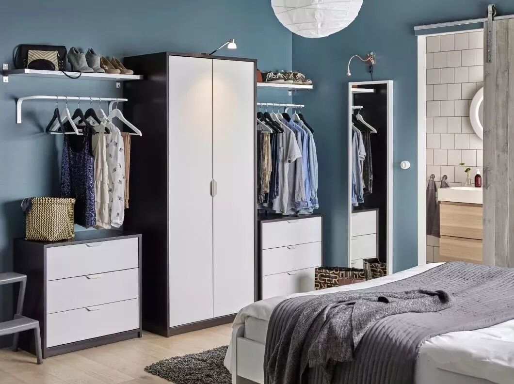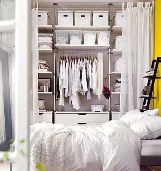 开放式衣柜最大的问题就是灰尘,可以在在柜顶/天花板上钉个轨道,加个布帘/纱帘,阻挡灰尘。同时为了看起来不凌乱,可以多用一些透明盒子或编织篮来存储衣物。