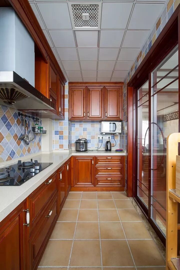 中式风格是咱们的传统,而把中式的橱柜装到厨房里面,效果也是想得相当的高档端庄;