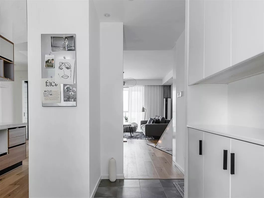 进门处的鞋柜是通过把原有的墙面往里移动了30公分,做成了一体式嵌入鞋柜。打开房门,进入视线的是典型的黑白灰设计,白色的一体式鞋柜和墙面、黑色把手、灰色的地板砖和生活贴画营造了干净轻松的氛围。