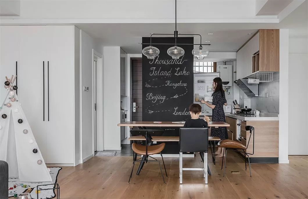 利用黑板漆在餐厅打造一面景观墙,墙面上制定了生活计划,不需要多么精美的画作就能让温馨感爆棚。工业风铁椅具有独特的美感,并且耐用,与条凳的组合碰撞出别具一格的火花。