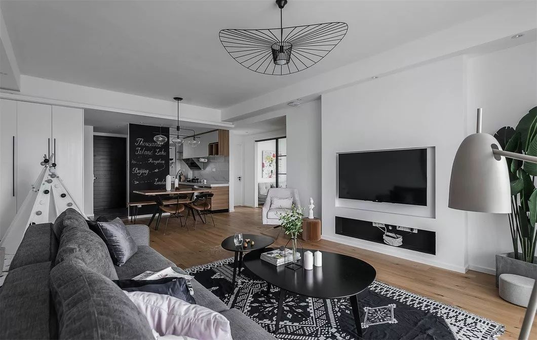 原户型是传统的三室两厅,本身不需要多少改动。玄关、厨房、餐厅、客厅做成开放式循环空间,有效利用空间的同时,动线更加合理。