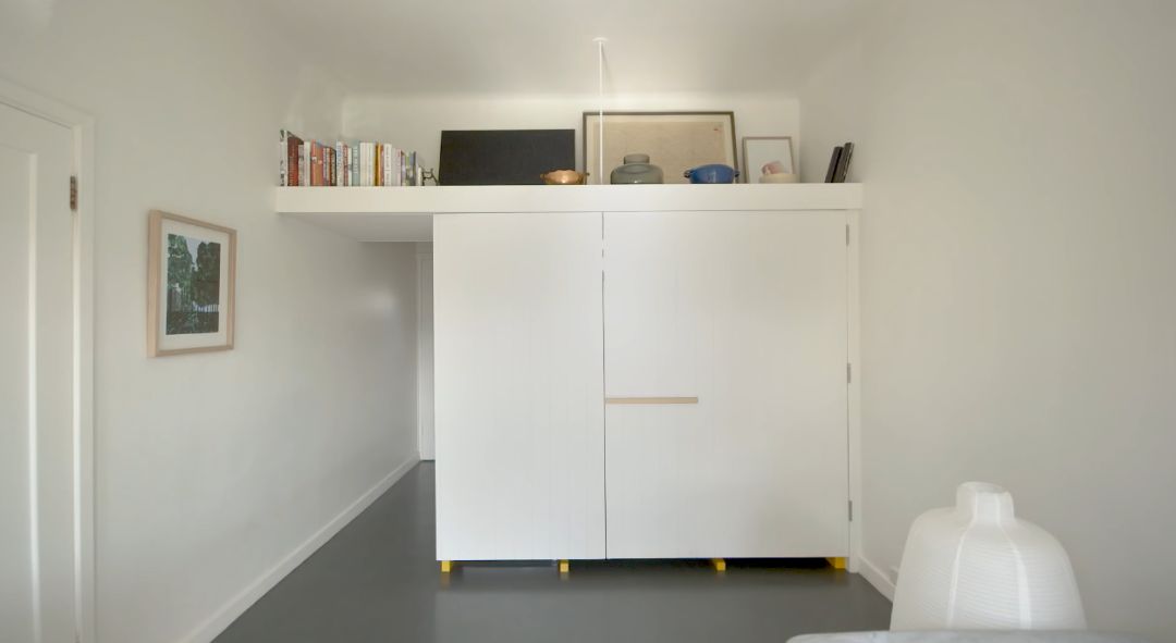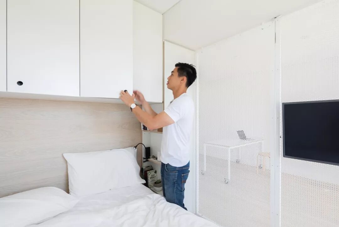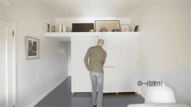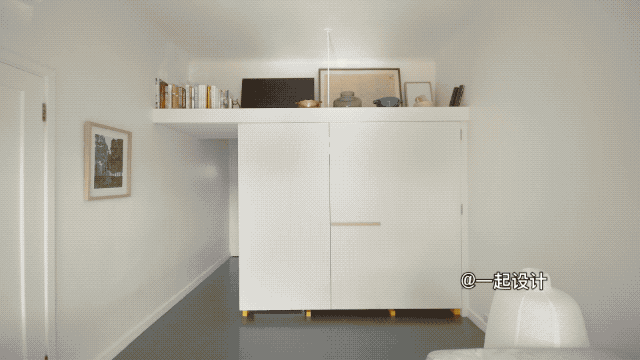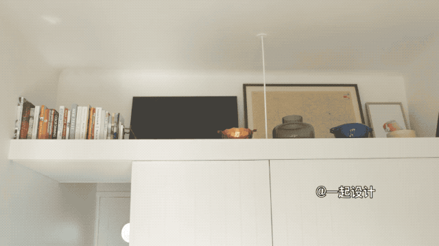 如果不看电视,也可以将它隐藏起来,拉出最下方的白色隔板,平时在上面办公、阅读皆可,无形中促成了一个新的功能区域的诞生。