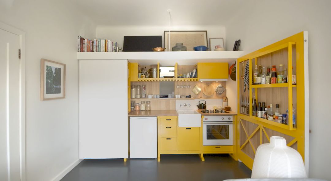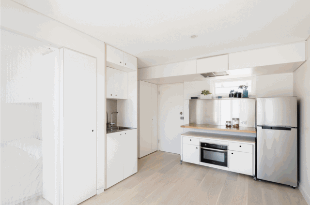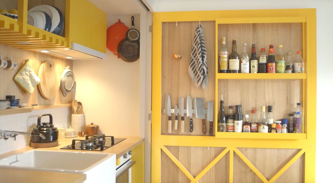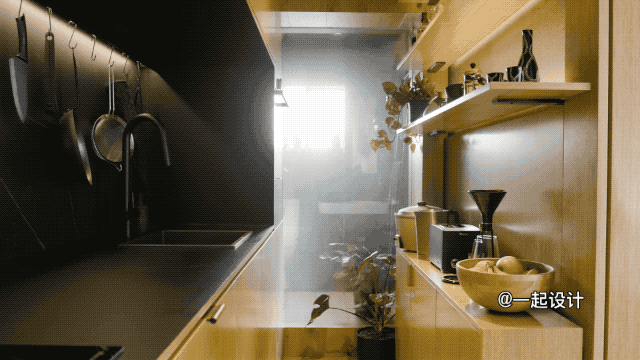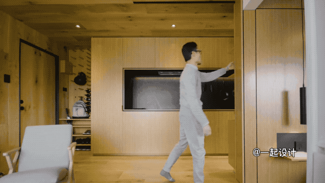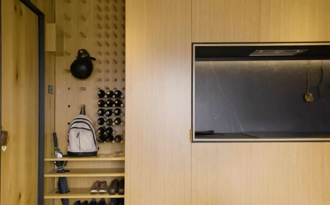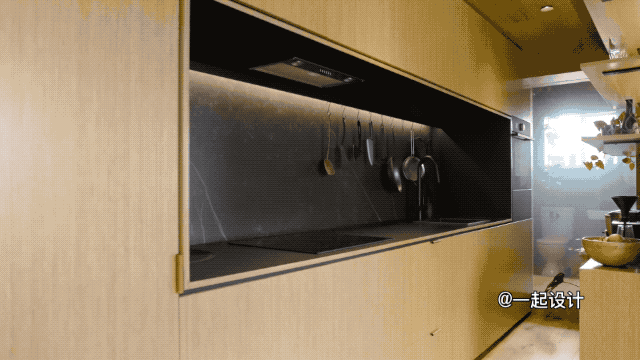 这不是一个常规的空间设计,而是将整个厨房全部隐藏起来,里面的功能应有尽有,并进行适当分类,取放时一目了然。