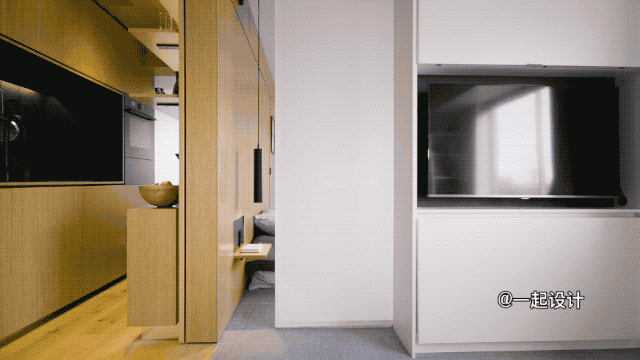 打开这面白色的金属板,就可以看到背面的电视机了!可翻转式设计不仅省下了电视柜,而且能让电视服务于多个空间,以便多视角地获得视听效果。