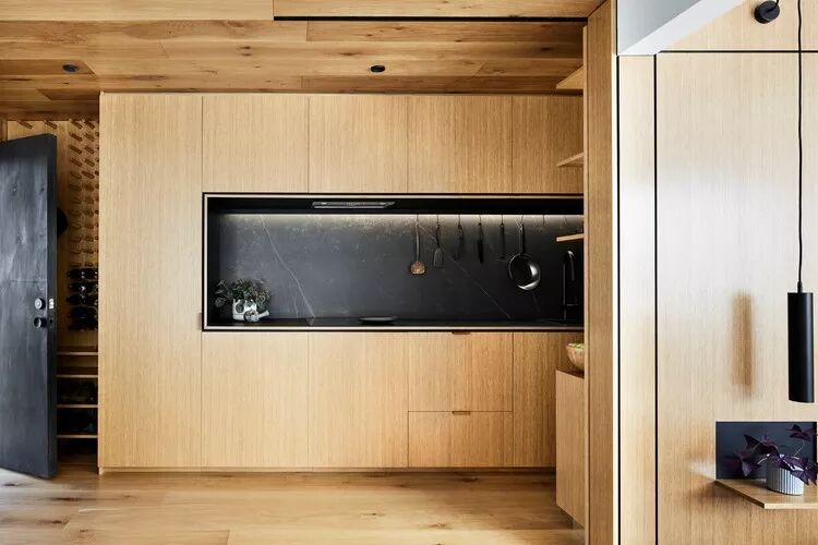 厨房操作区域以黑色大理石为基调,与温润的木饰面产生鲜明的对比,并由此大大丰富了小空间的层次感。