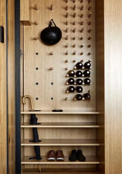 简单的隔板与洞洞墙可以发挥多功能的收纳作用,让出入更加便利、随心。