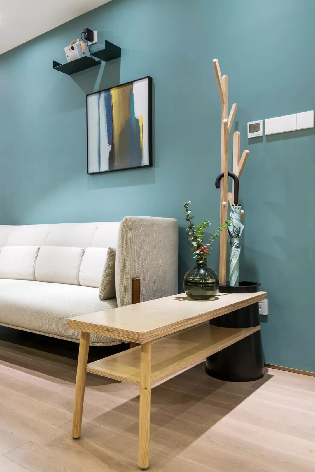 与原木色地板,以及墙面简洁明快的线条,