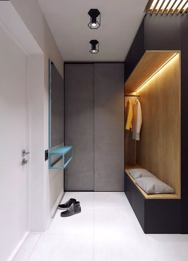 嵌入式壁柜是节省空间的利器,它的外观简约大气,内部收纳空间也很充足,可以设计成半开放+半封闭的形式,让换鞋凳和收纳区融为一体,整个门厅就不会显得又挤又乱了。