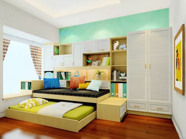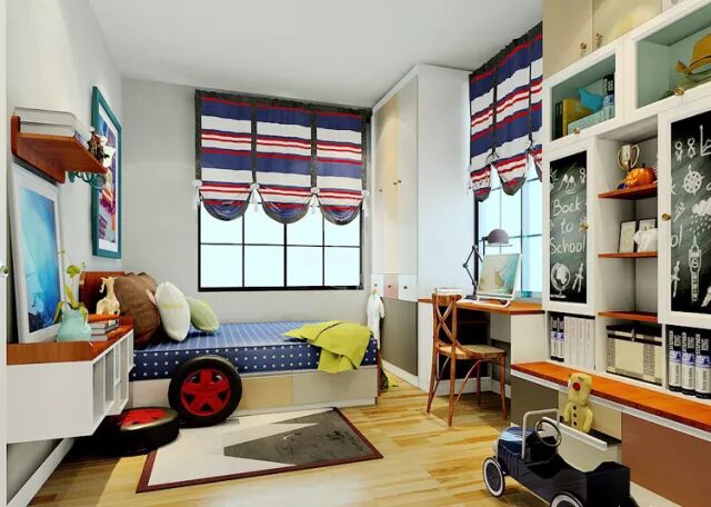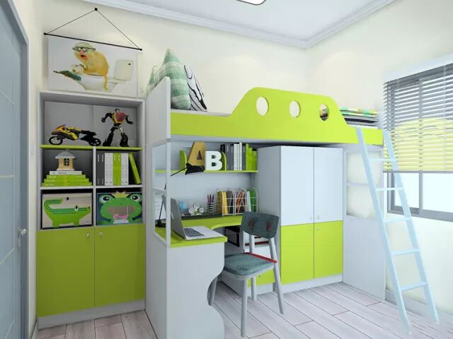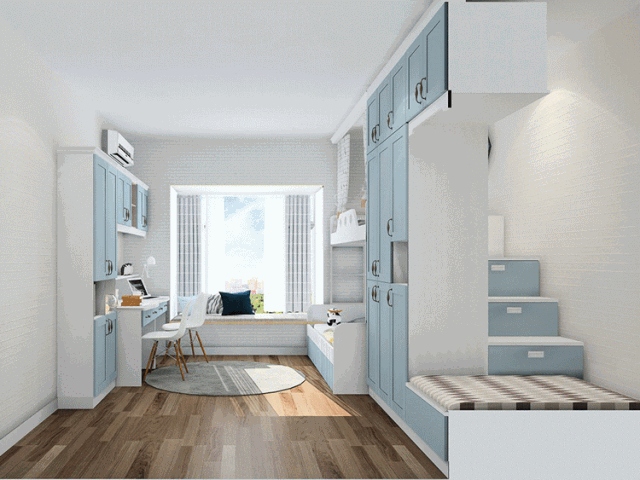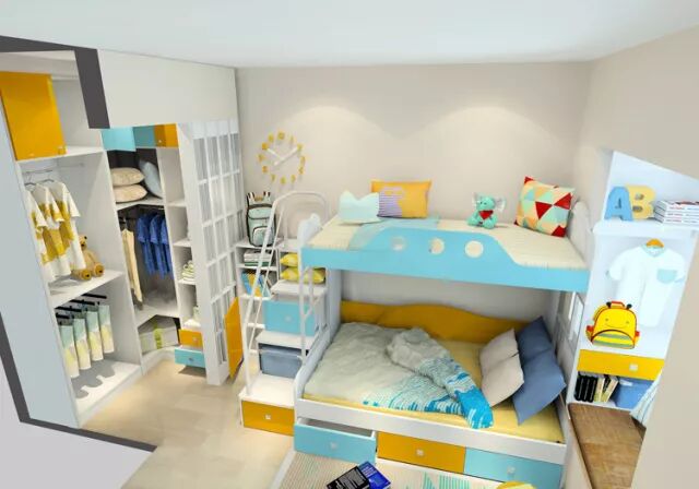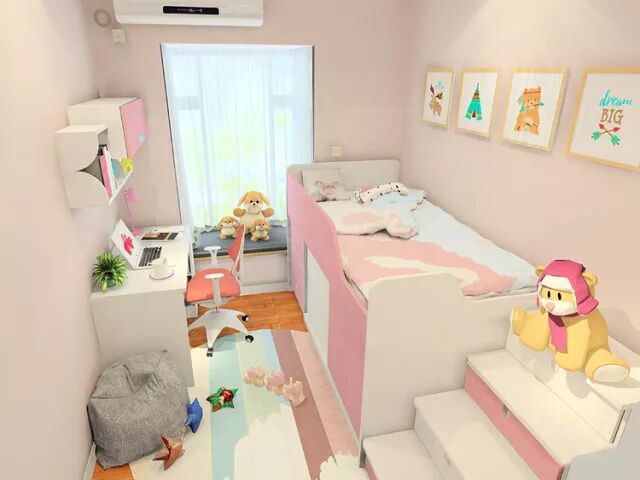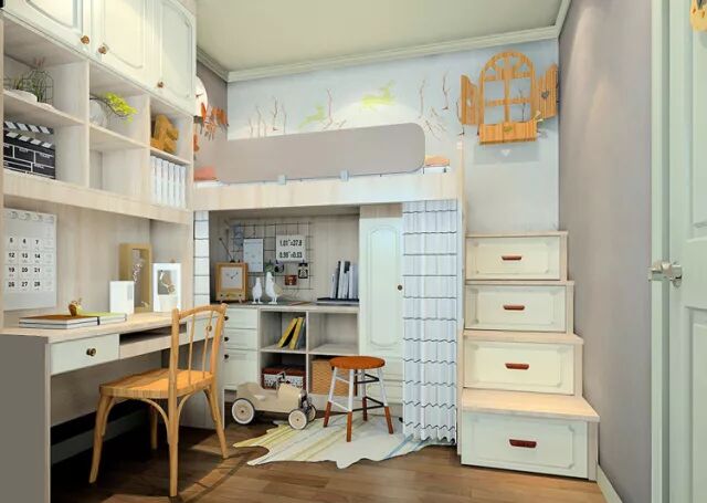 △单人儿童房,不少家庭都选择了高架床的设计,这样一来下面可以做的东西可就多了!书桌、小衣柜、玩具收纳、游戏区…爱TA,当然得给TA完整的欢乐童年~