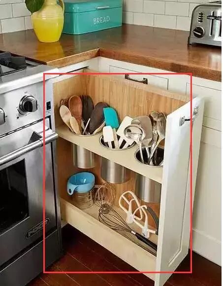 4.做一个专门用来存放汤匙的拉篮,小拉篮占用的位置很少,收纳很好用。
