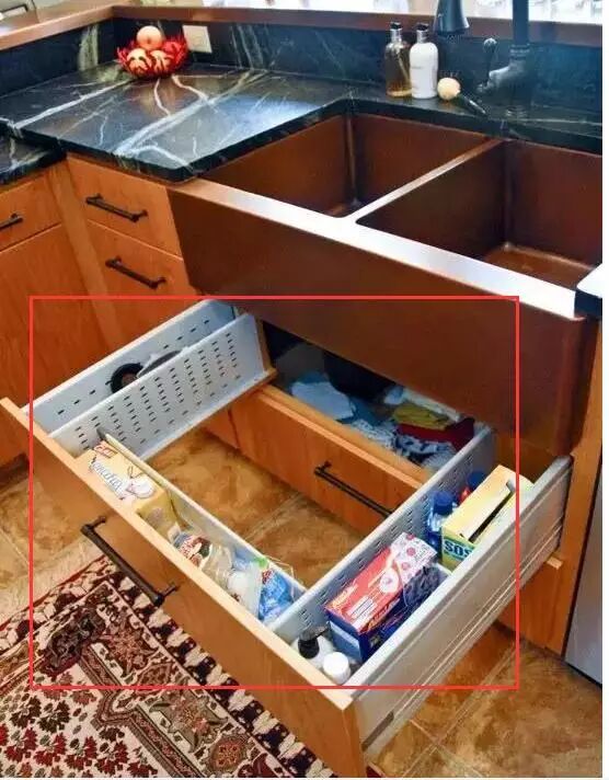 3.水槽底部做个拉篮用来存放一些小物件,需要用的时候拉出来,非常省事方便。