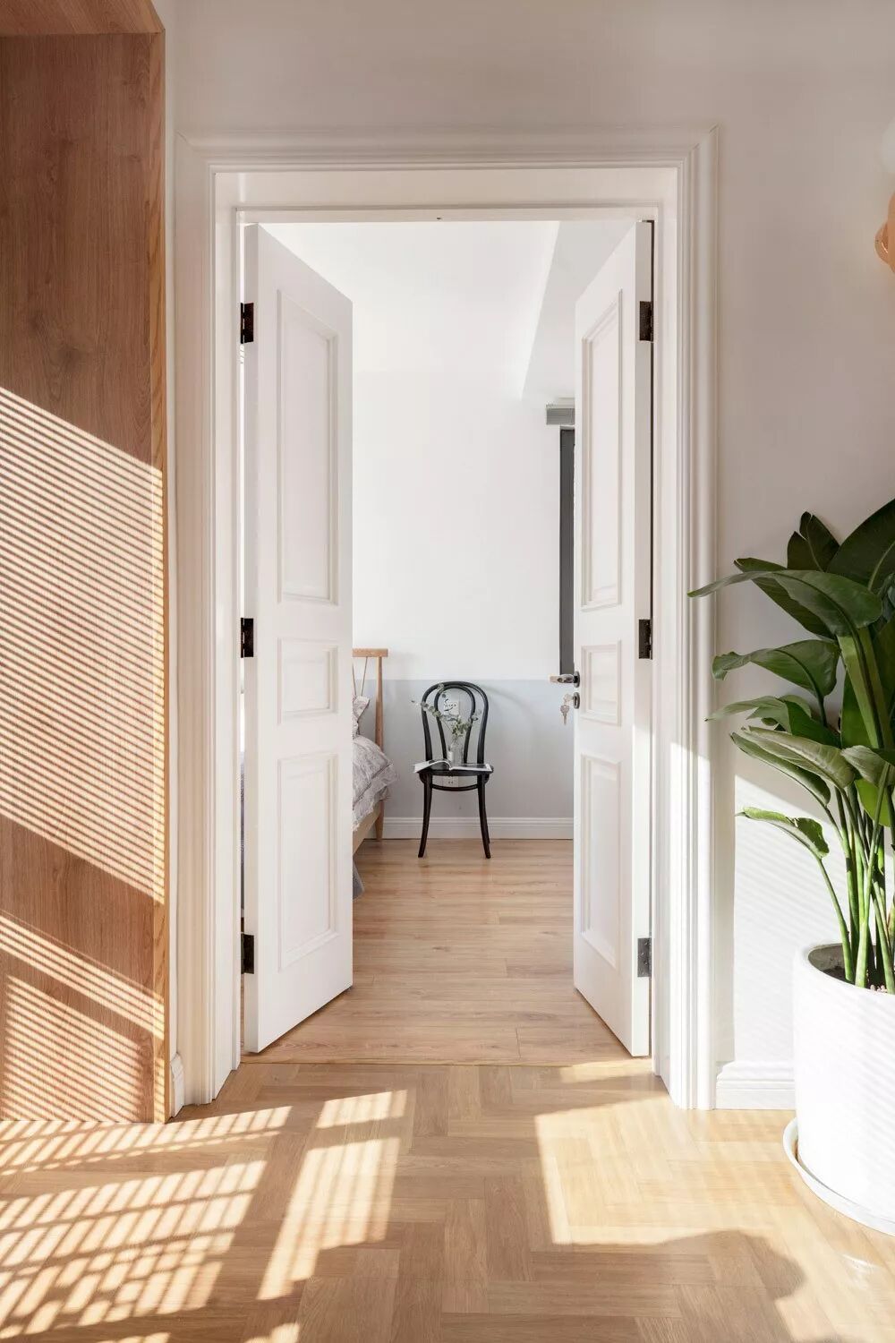 卧室门做成了双开门,如果是单开门,门太长,开合会打到床和玻璃隔断,双开门就避免了这种尴尬的情况发生。