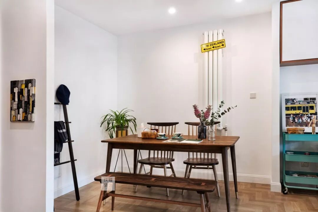 餐桌一边是长凳,一边采用了温莎椅。顶部做了平面吊顶后选择筒灯作为照明,餐厅的设计非常简单。