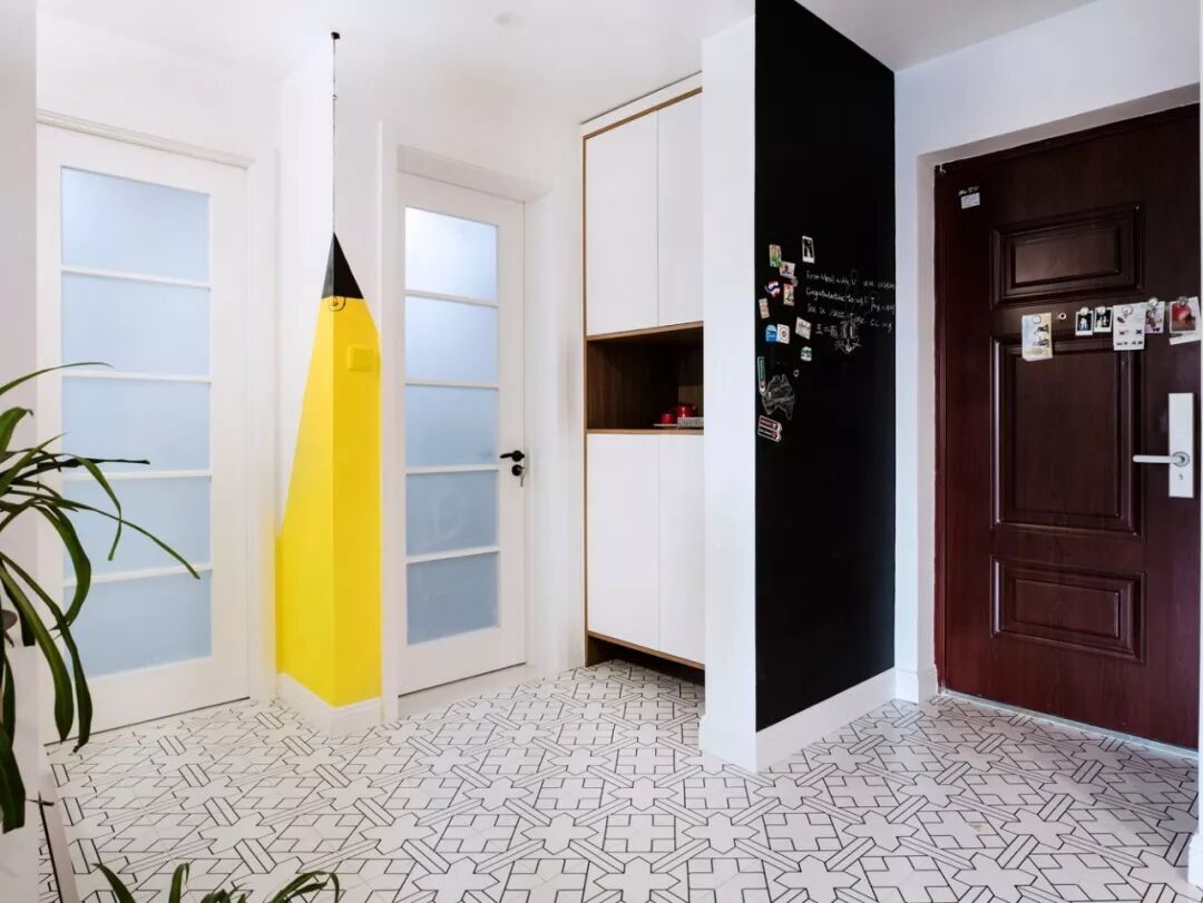 进门右手边设计了一面黑板墙,满足了业主想要一块不太大的黑板墙的需求。
