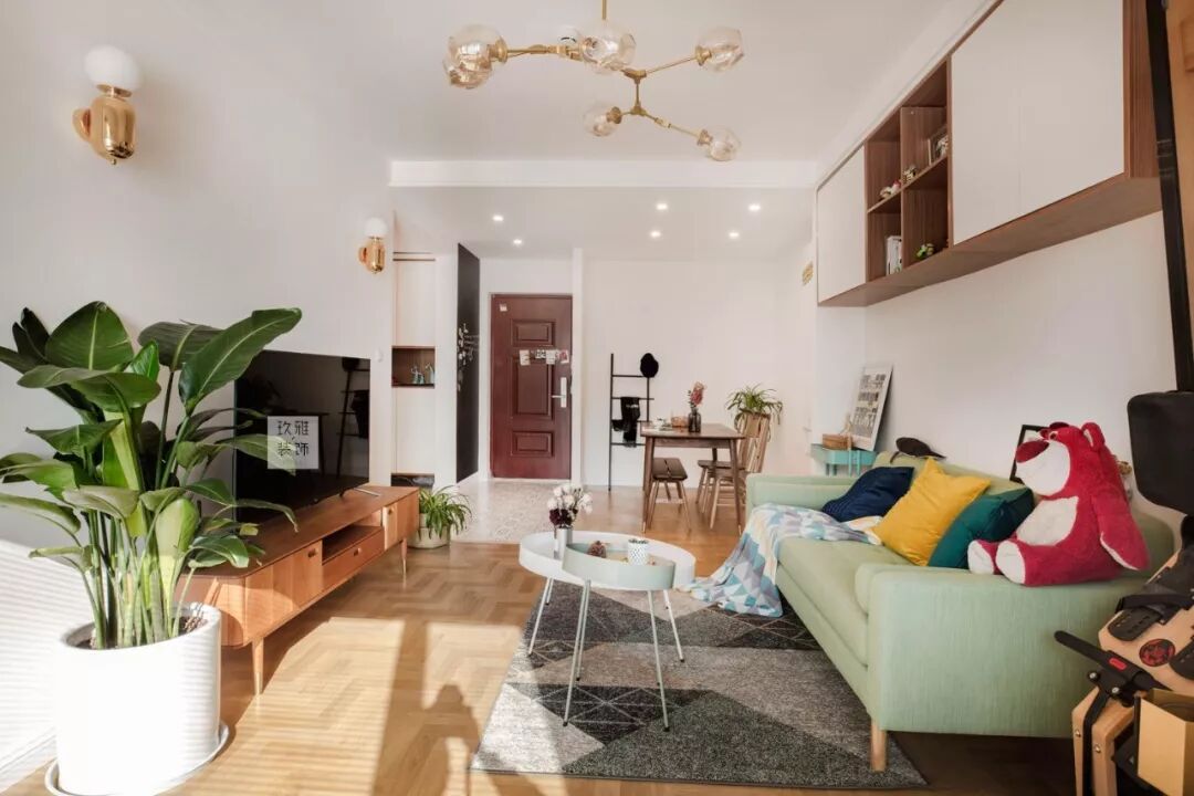 客厅色调以绿色为主,以黄、蓝、粉为点缀色,添加了铜元素和木制品。客厅的软装单品都是采用了一些比较简单典型的北欧搭配。